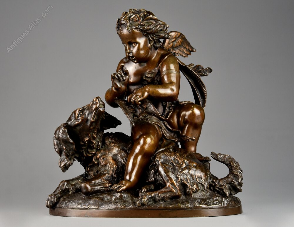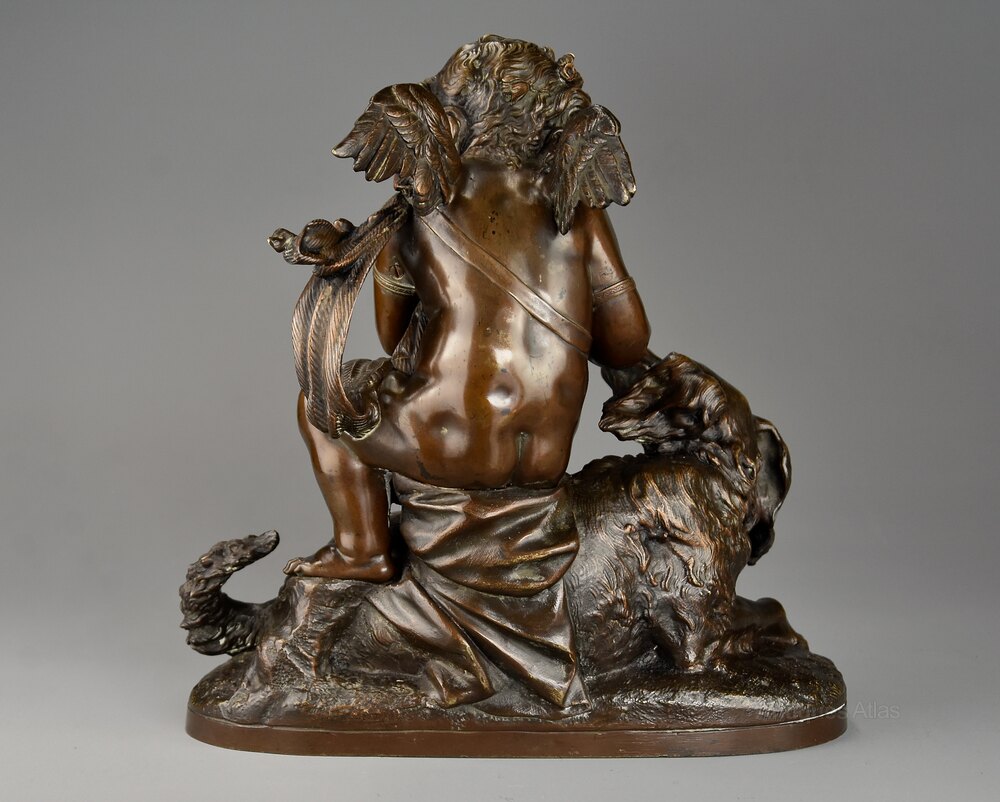 A charming late 19th century fine quality French bronze of a winged putto and spaniel dog.
