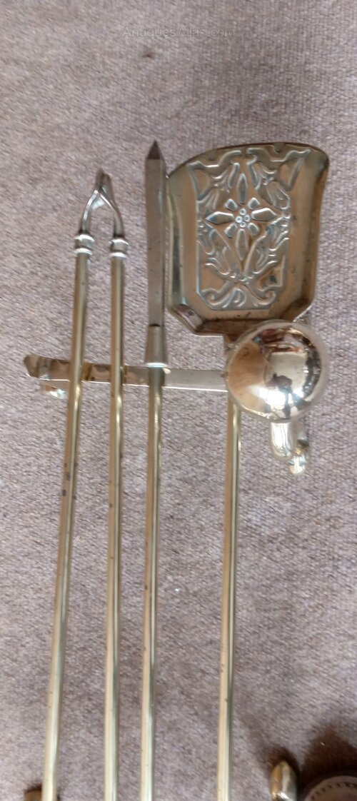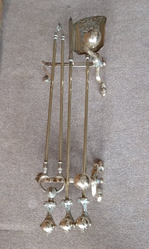 Here is a Beautiful Set of Victorian/Edwardian FIRE IRONS. They are made of SOLID BRASS and weigh quite a weight! Polished by my Hands recently, they would grace any Fireplace be it Modern or Large Open Fireplace. The Cost of the Set with Dogs is £115. Most Fire Irons of that Period will be roughtly the same measurements, namely 26 inches for the Fire Irons and the Dogs are 10.5 inches.