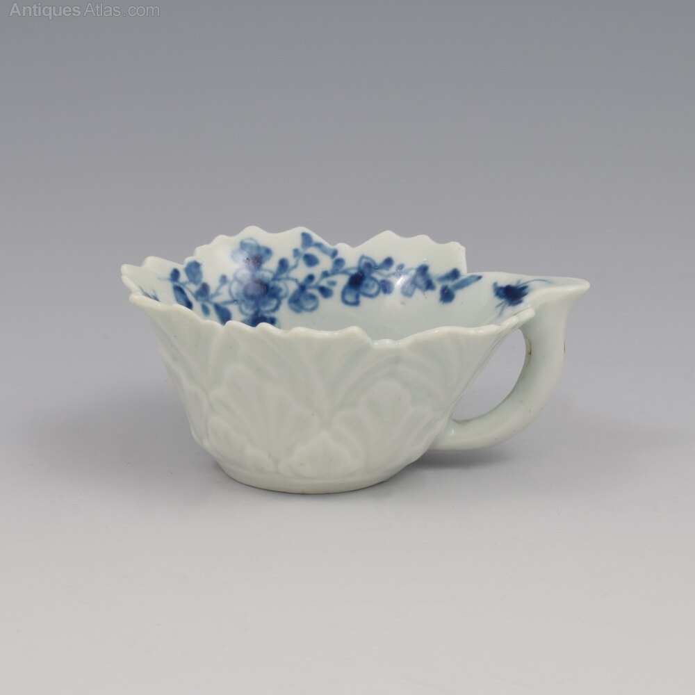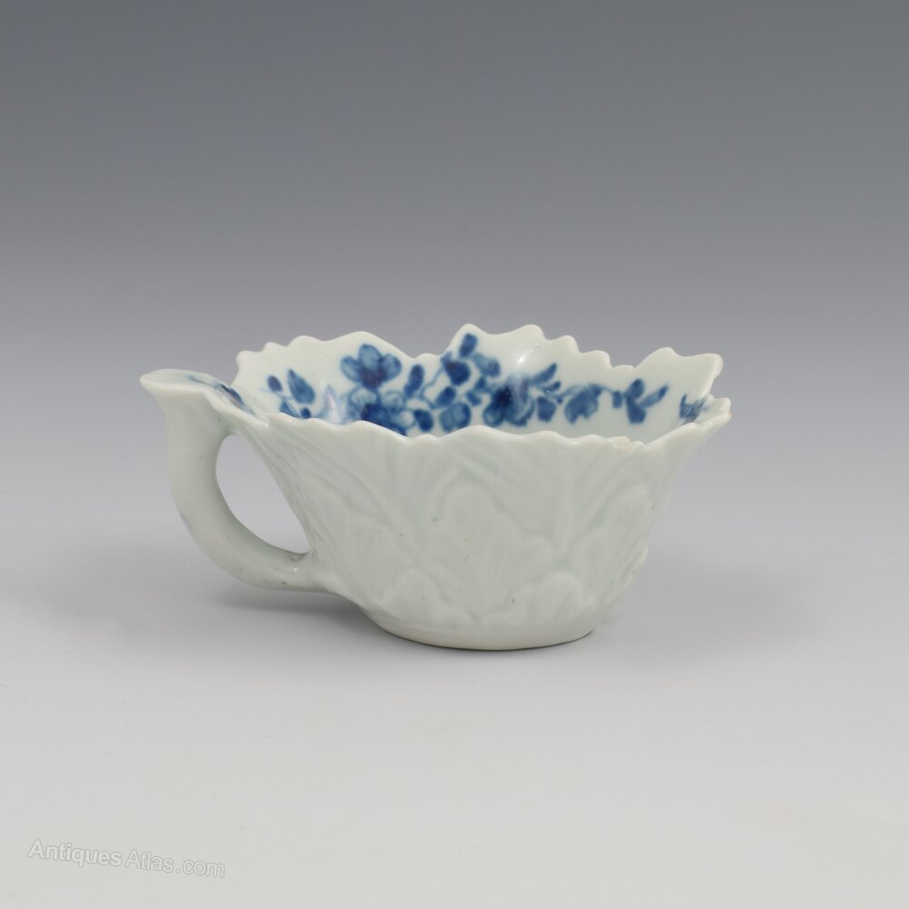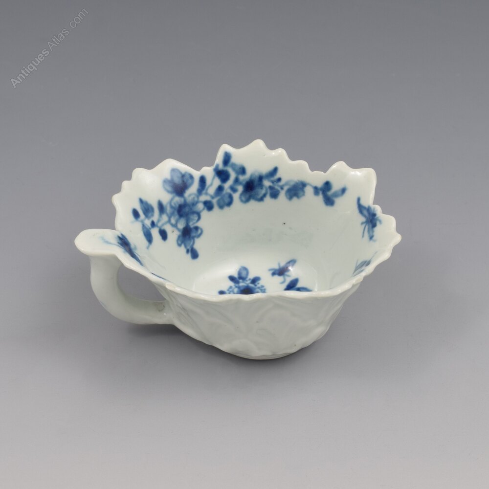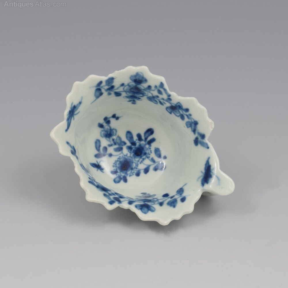 A delightful Worcester blue and white porcelain butter boat moulded with geranium leaf exterior with irregular shaped rim and looped stalk handle with flat lug thumb rest. Painted with the "pickle leaf daisy" pattern, c.1758-1760. Small workman's mark to the base.