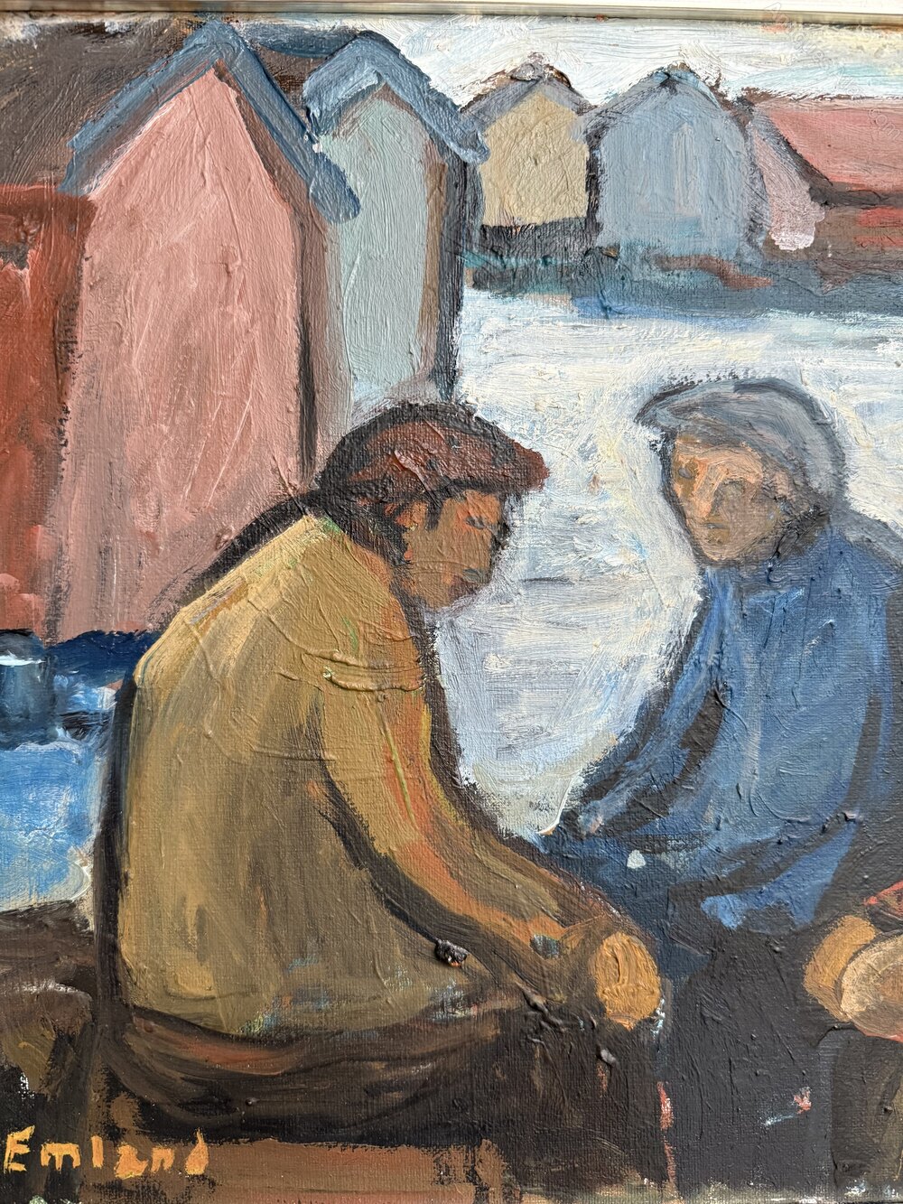 Superb original vintage Swedish oil painting of a colourful harbour scene with three fishermen chatting. Really lovely piece of artwork in an excellent condition and well framed. By listed Swedish artist Einar Emland (1916-1994). Emland painted a series of fishing scenes in the 1960s. Signed by the artist lower left.