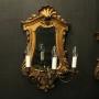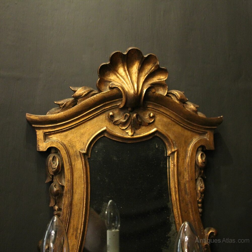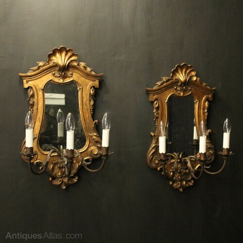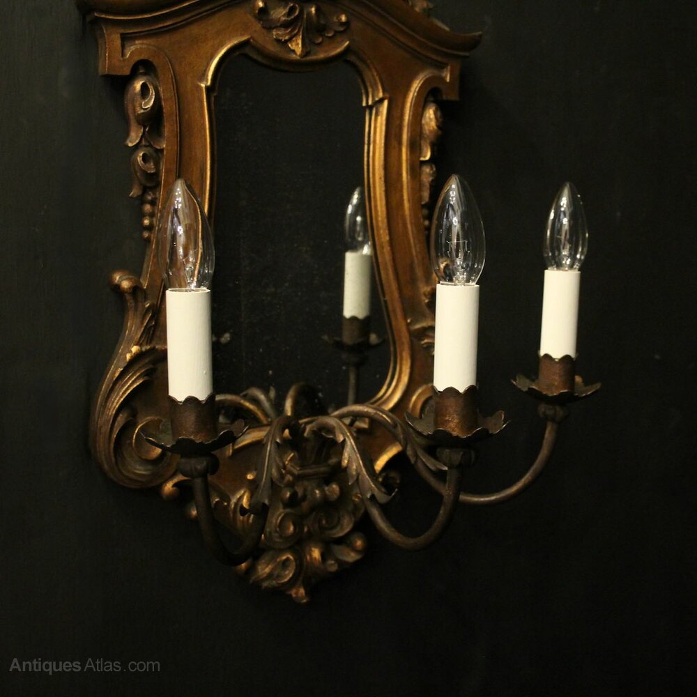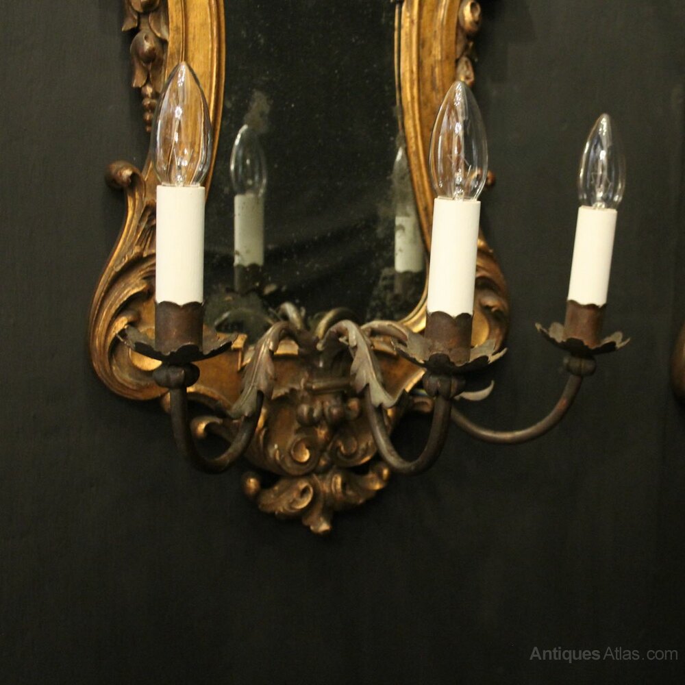 An Italian Florentine pair of giltwood and toleware triple arm mirrored antique girandoles, the metal leaf scrolling arms with scalloped candle sconces, issuing from an ornate giltwood mirrored leaf backplate with ornate carved scallop finial, great original patination and good large scale with original mottled glass plates. Fully rewired and PAT tested. All our wall lights come with aged brass screws for fixing and spare bulbs.