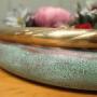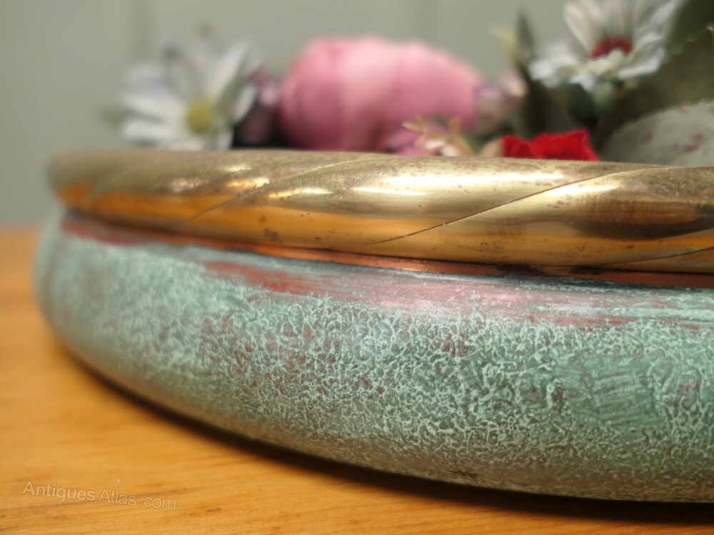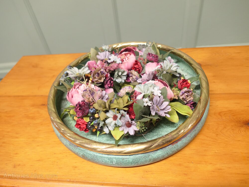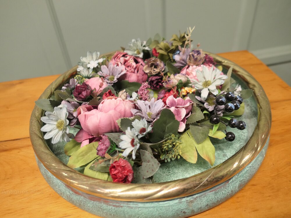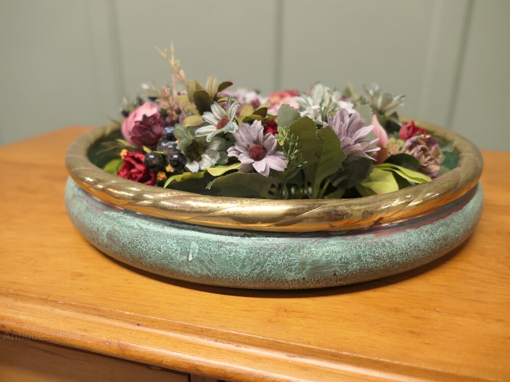 This is a very unusual piece, the copper bowl is beautifully verdigris patinated however the heavy brass rim is bright and shiny, a nice combination, the bowl has a delightful hand made wreath with silk flowers and fruits but it would look wonderful filled with roses.