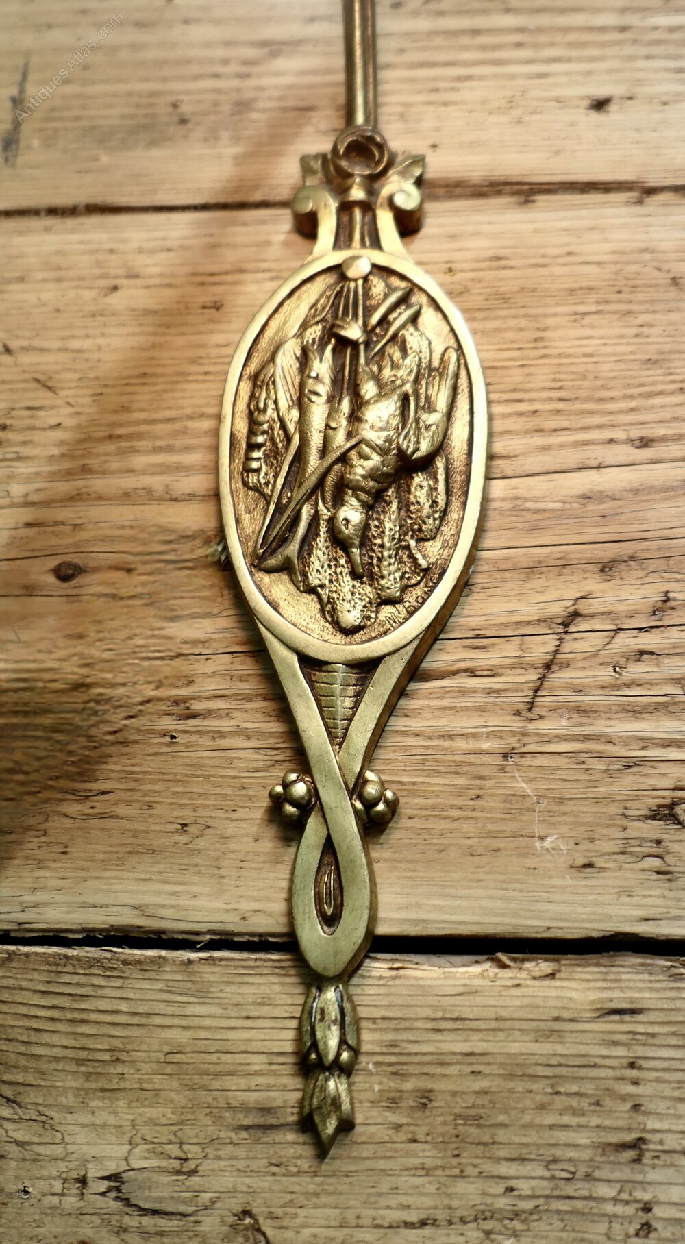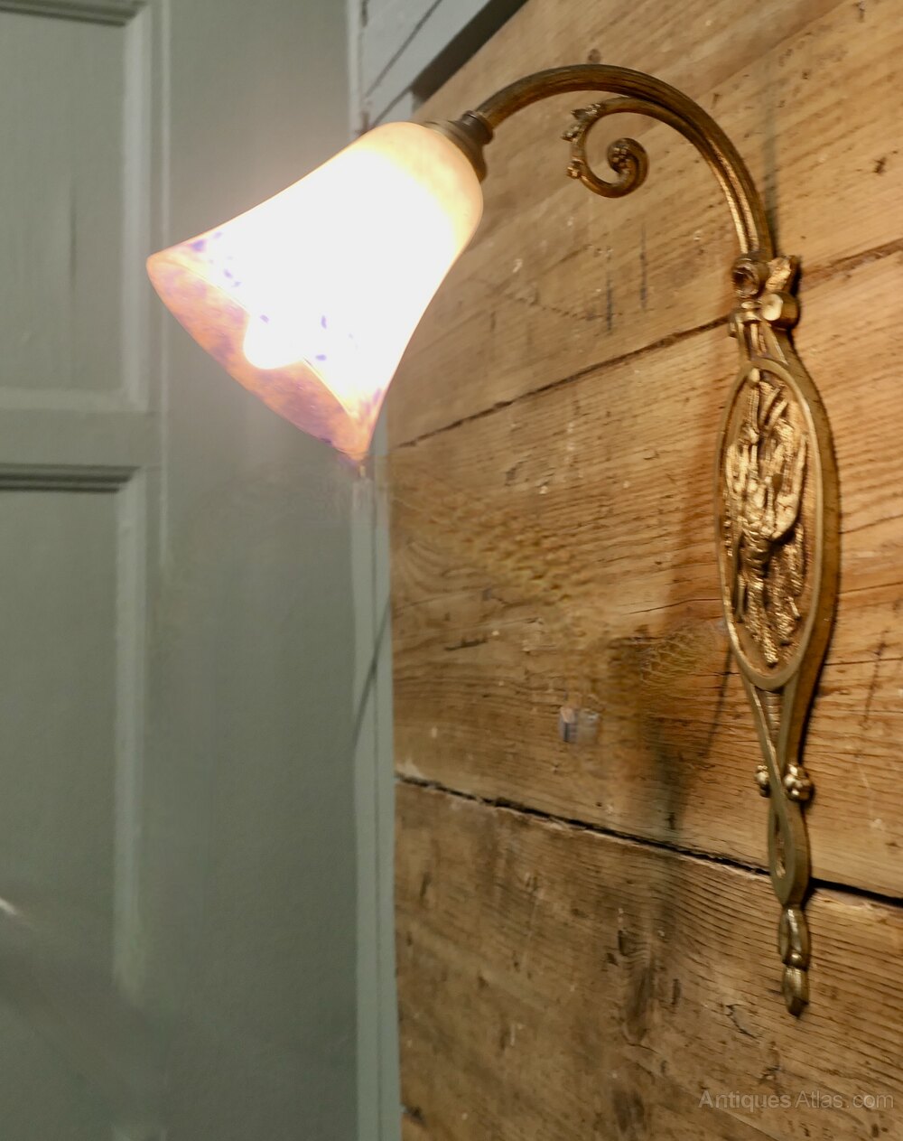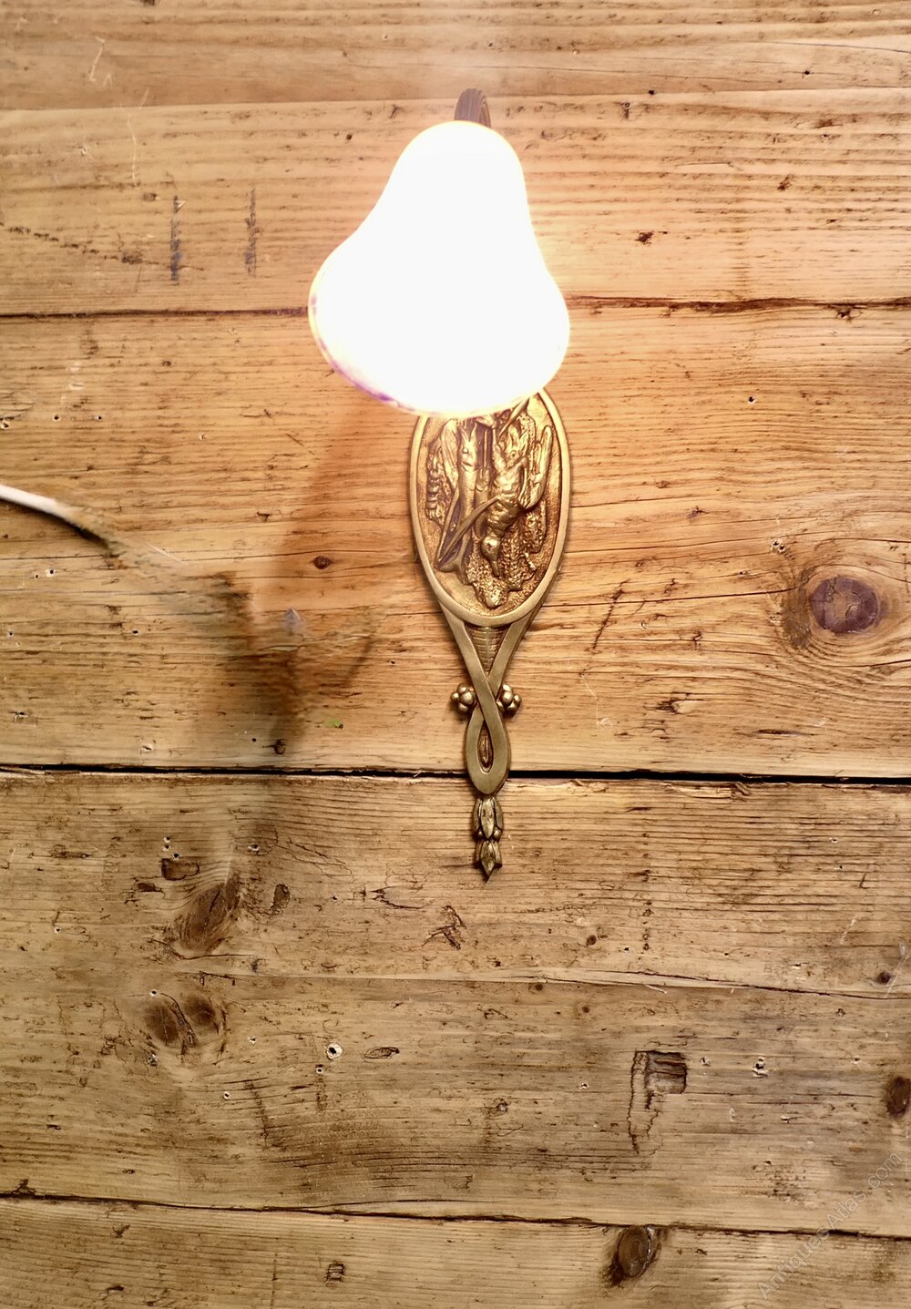 The Light has a brass swan neck arm and a back plate decorated with a hunting theme, a really lovely piece.