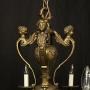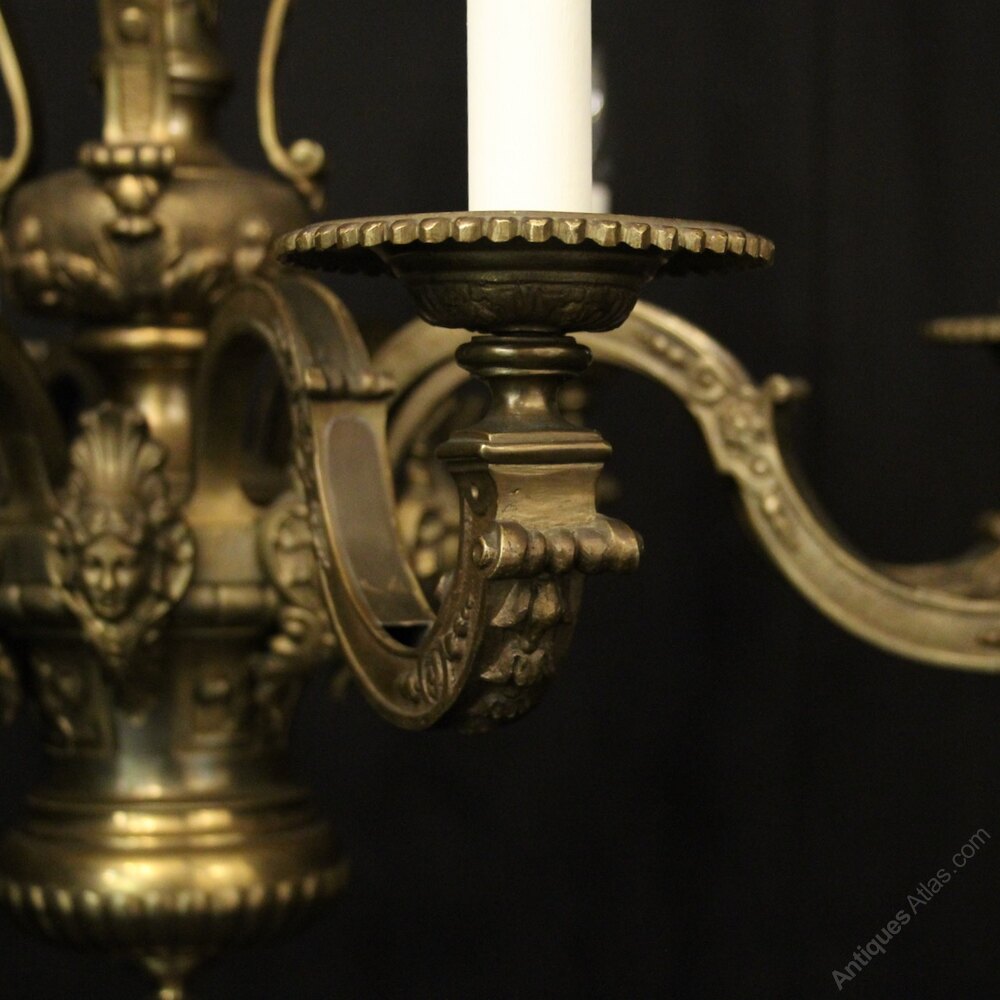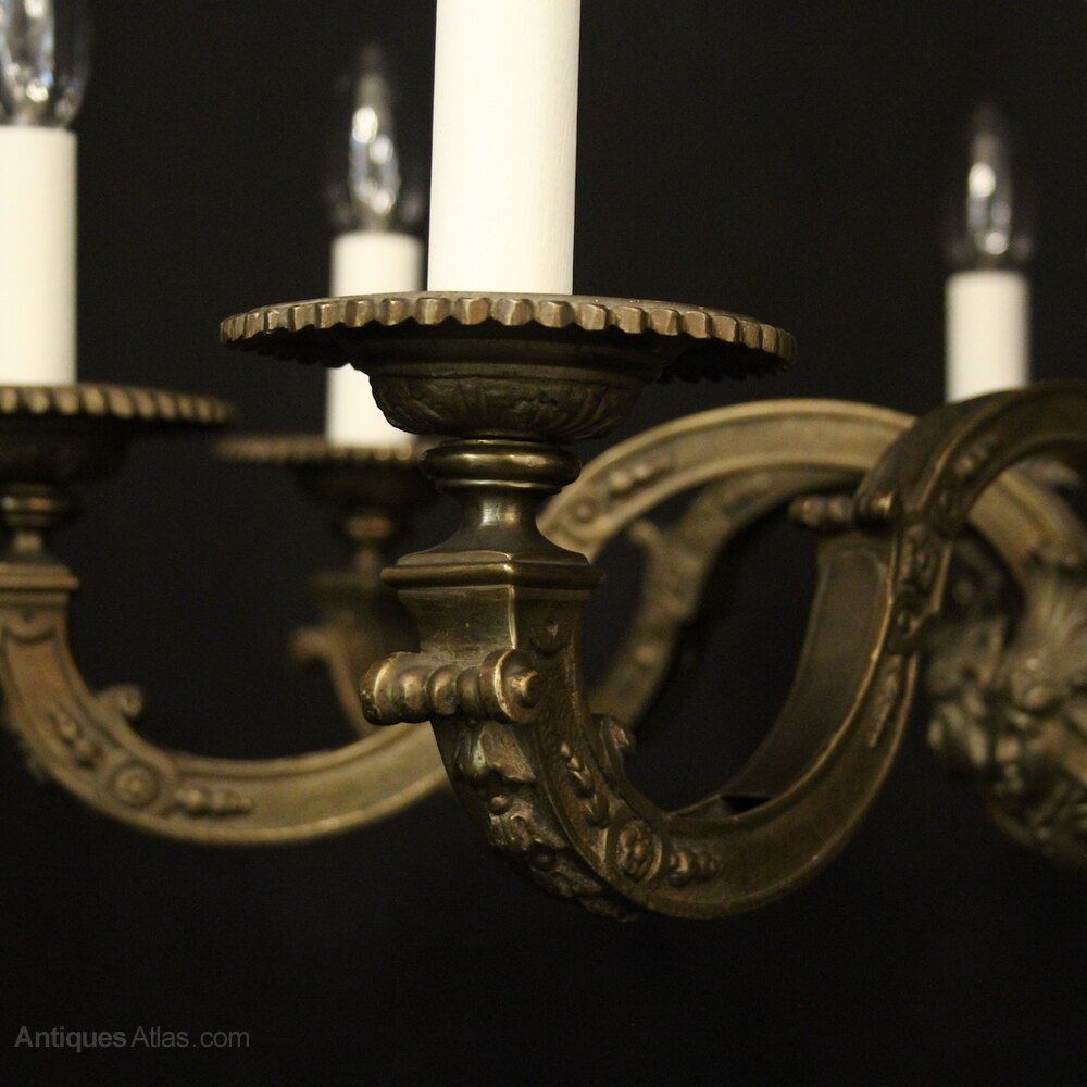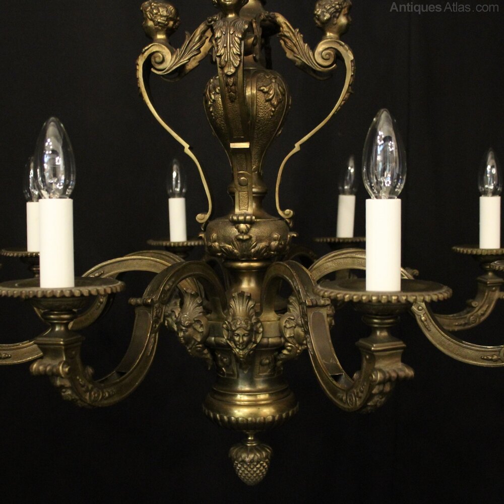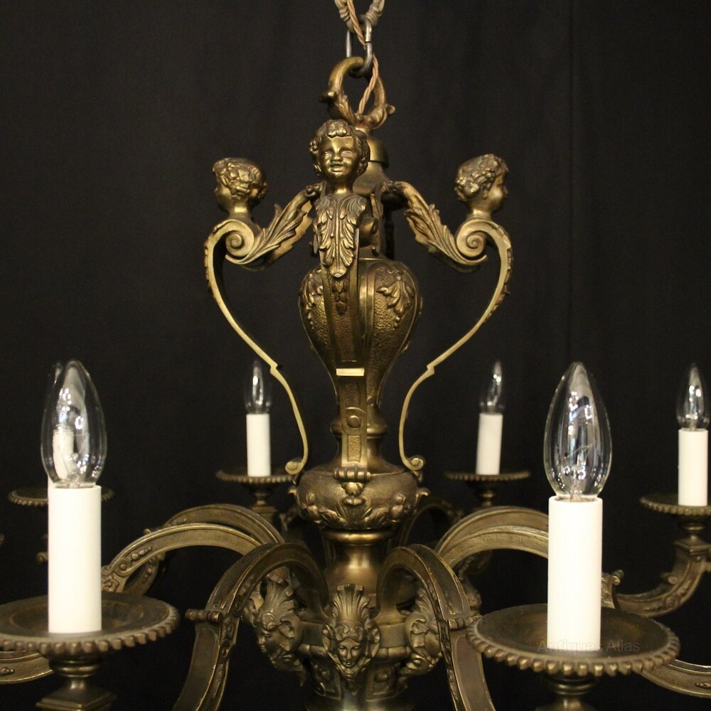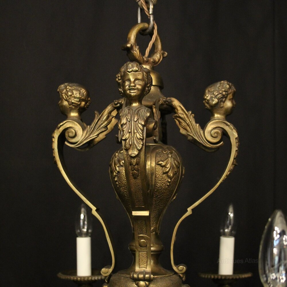 A French faded gilded bronze 8 light antique chandelier, the leaf clad square gauge scrolling arms with ornate circular bobeche drip pans, issuing from a pierced central urn baluster stem with four cherubs and set below with decorative female mask heads with reeded leaf base and inverted acorn finial, good faded original patination. Fully rewired and PAT tested. All our chandeliers come with bulbs and ceiling fixings.
