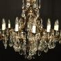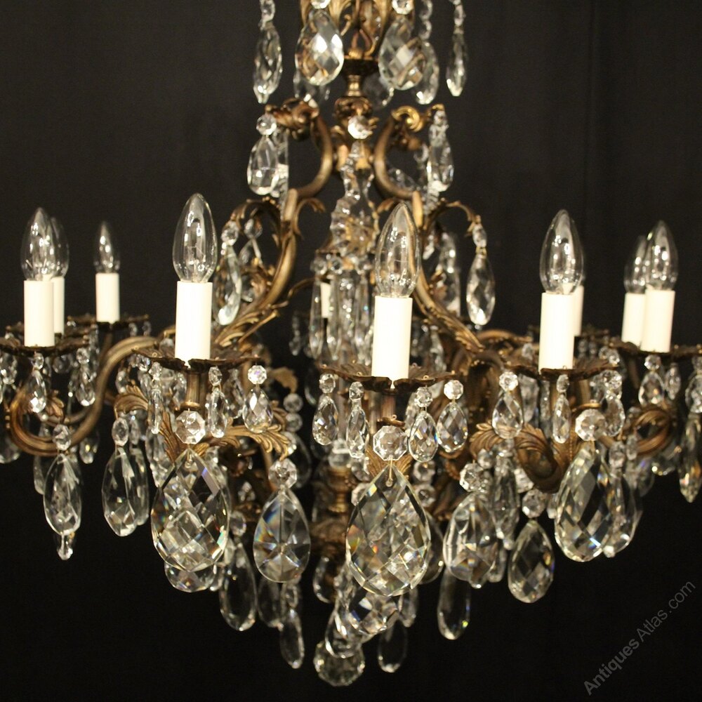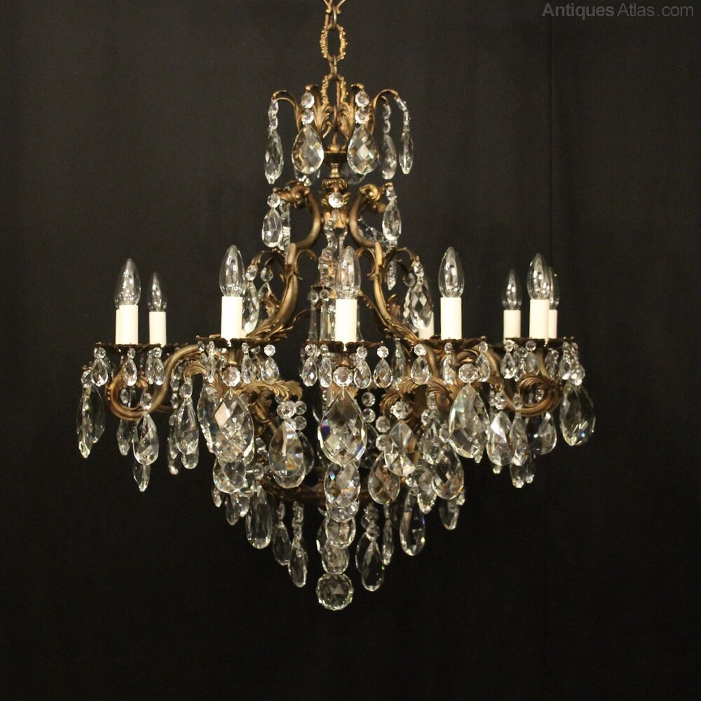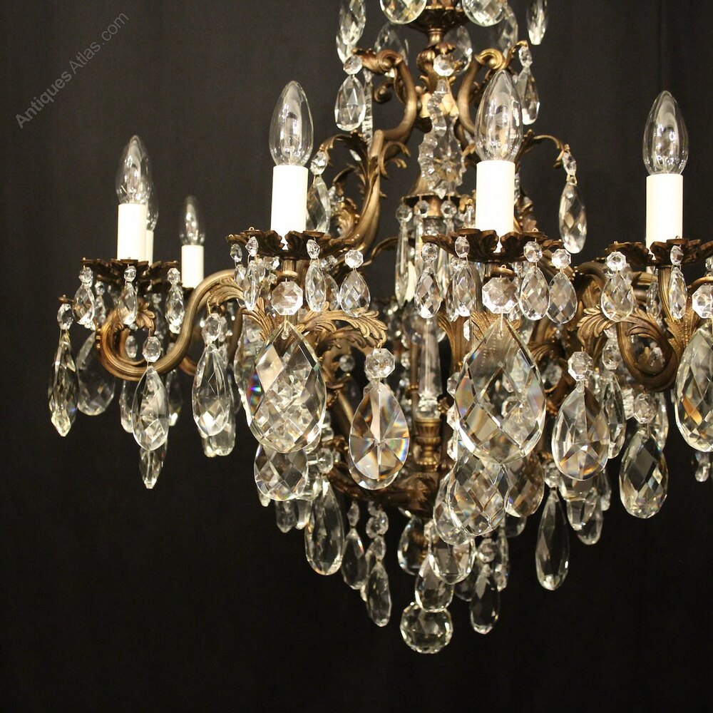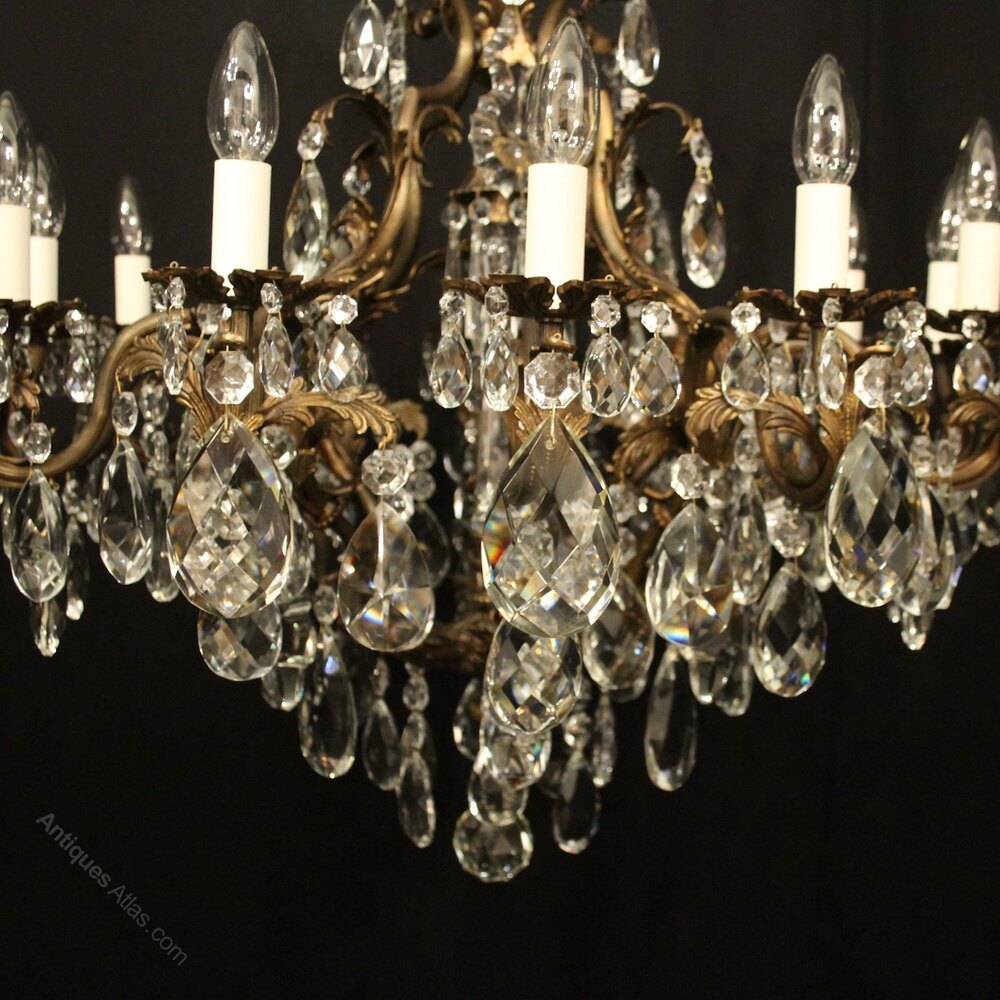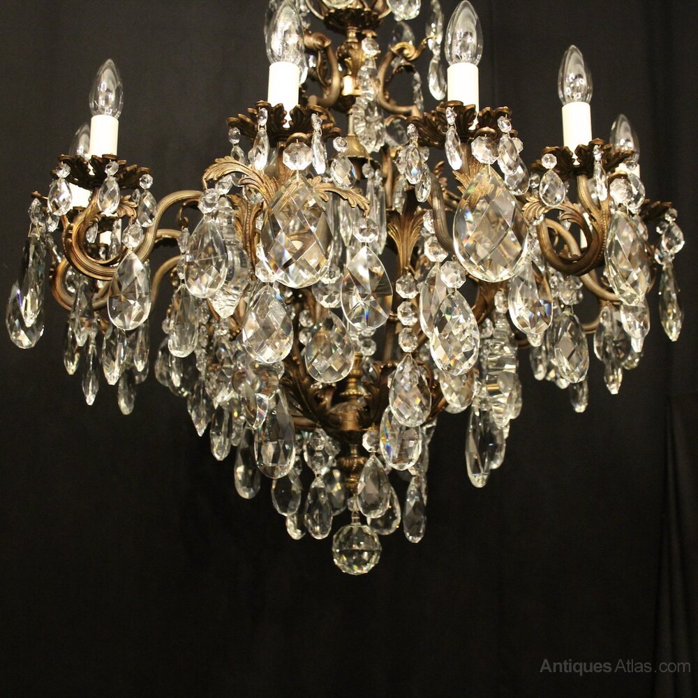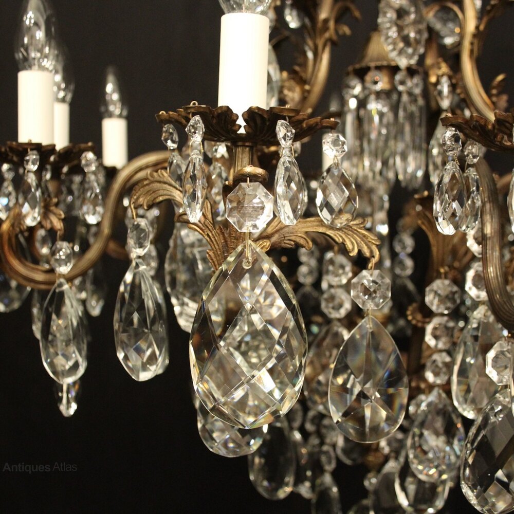 A French faded gilded bronze and crystal 13 light birdcage form antique chandelier, the 12 reeded scrolling arms with sectional leaf bobeche drip pans, issuing from a cage form interior with a single inverted light with a large interior prismatic spike and scrolling leaf canopy, decorated overall with crystal faceted pendants and having the original chain and ceiling rose. Fully rewired and PAT tested. All our chandeliers come with bulbs and ceiling fixings.