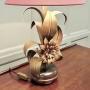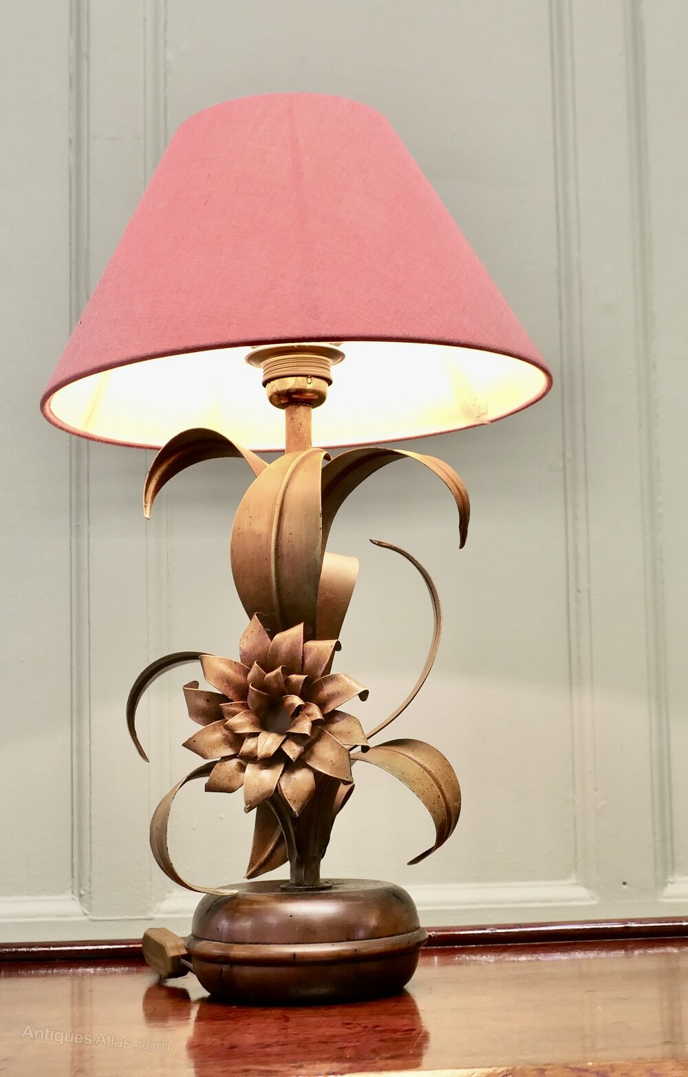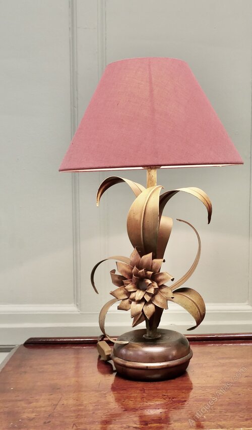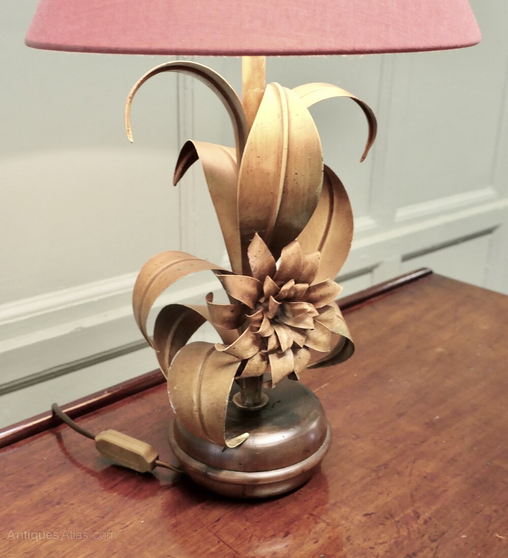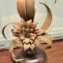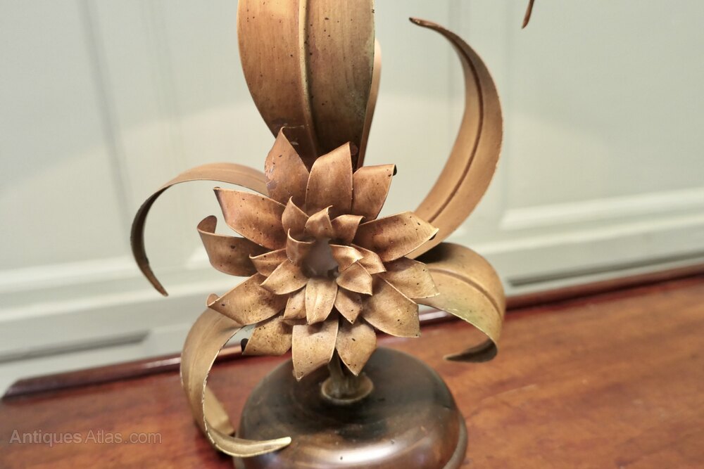 The lamp stands on a round base, and from this grows curling toleware leaves in shades of green and bronze with a large flower at the centre