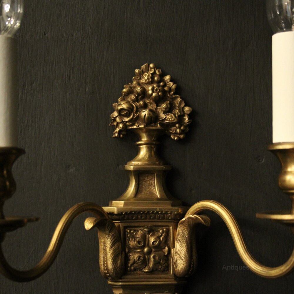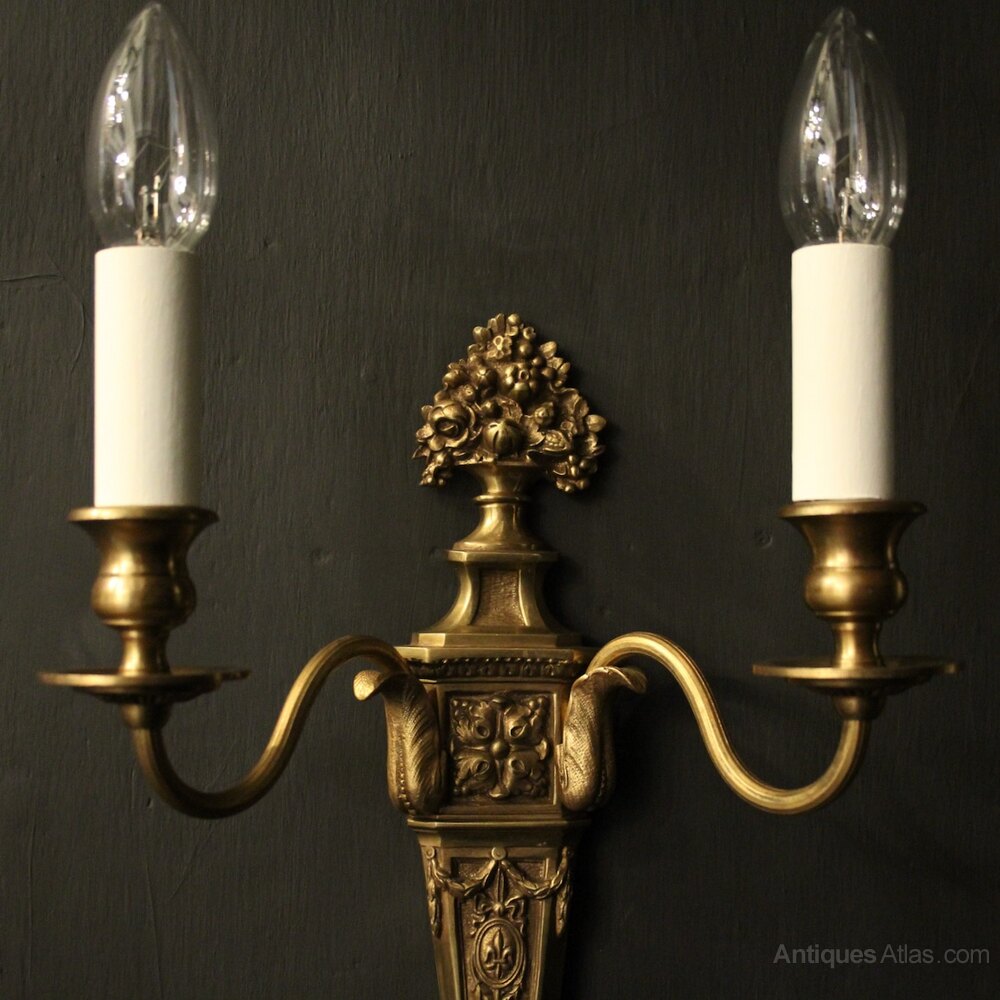 A nice French pair of gilded bronze twin arm antique wall lights, the reeded scrolling arms with circular bobeche drip pans and bulbous candle sconces, issuing from an tapering leaf backplate with floral finial, nice original patination. Fully rewired and PAT tested. All our wall lights come with aged brass screws or brackets for fixing and spare bulbs.