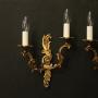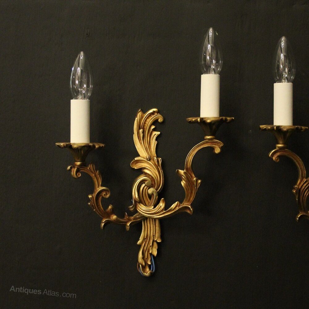 A French pair of gilded brass twin arm antique wall lights, the leaf clad scrolling arms with leaf bobeche drip pans, issuing from an opposing leaf backplate, nice original gilded patination. Fully rewired and PAT tested. All our wall lights come with aged brass screws for fixing and spare bulbs.