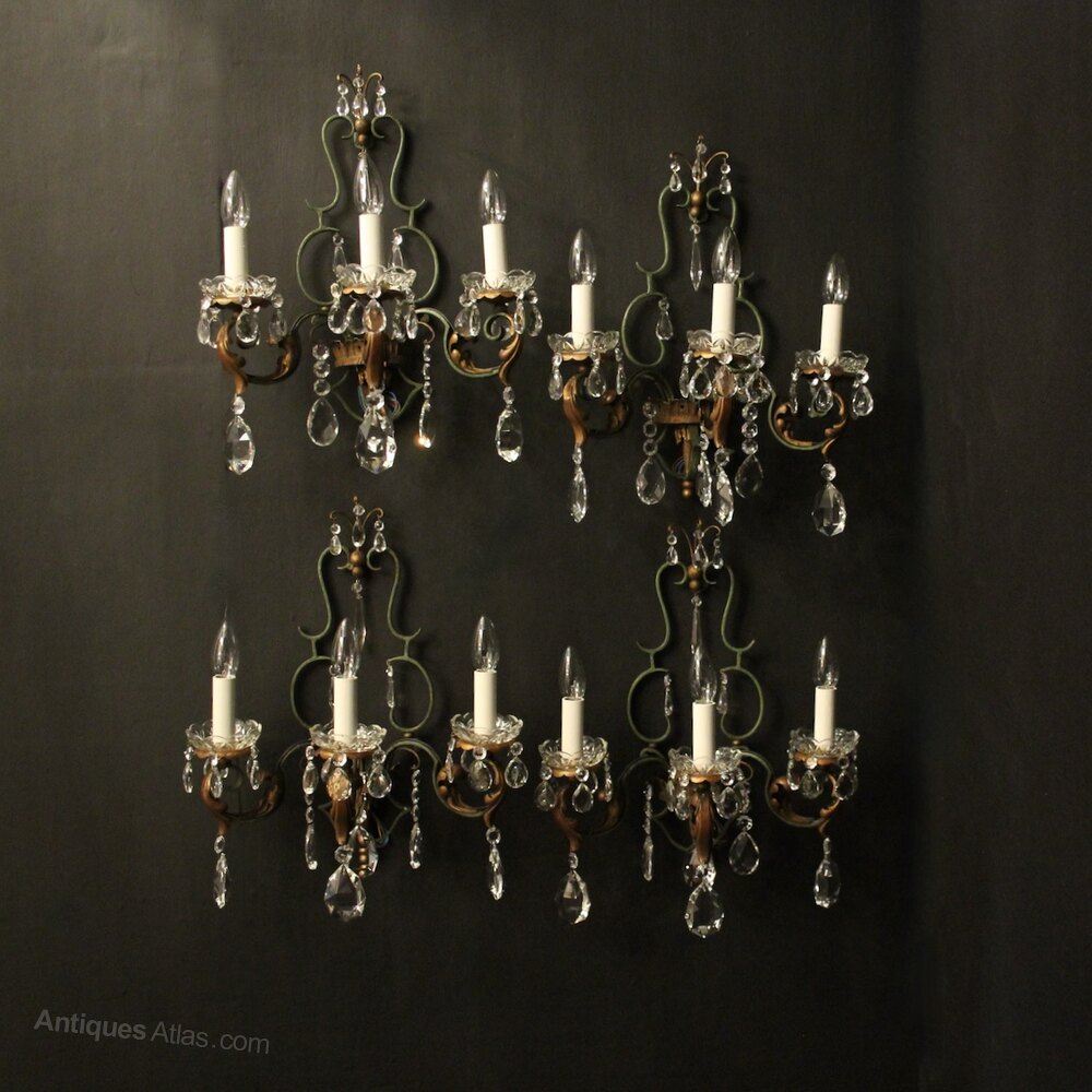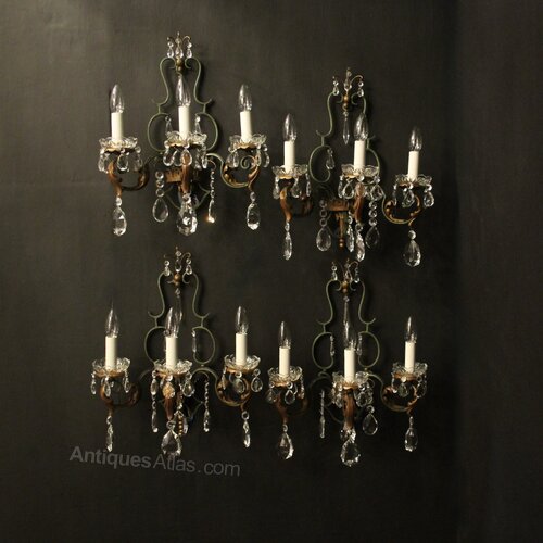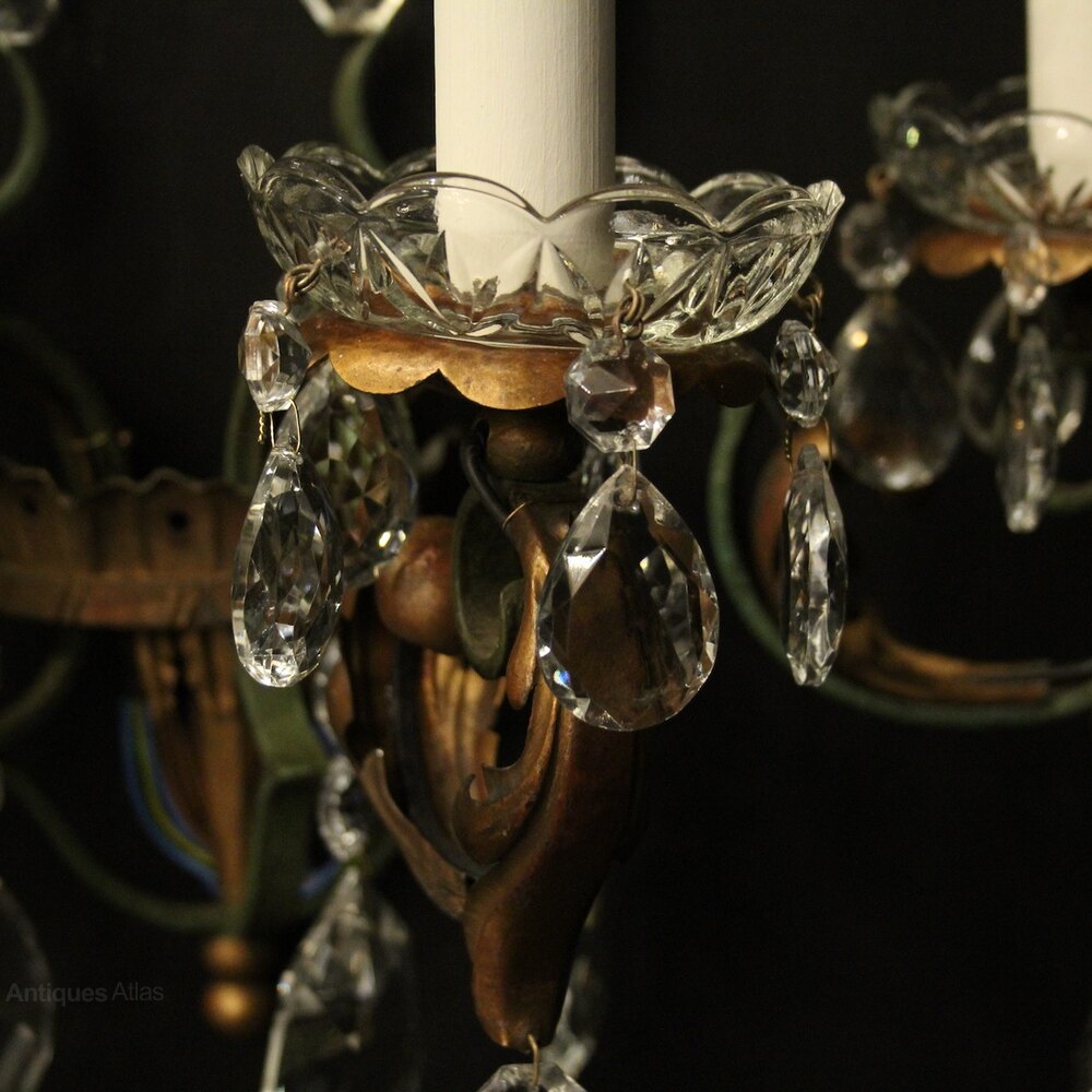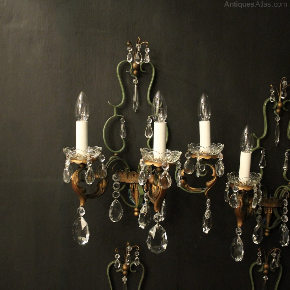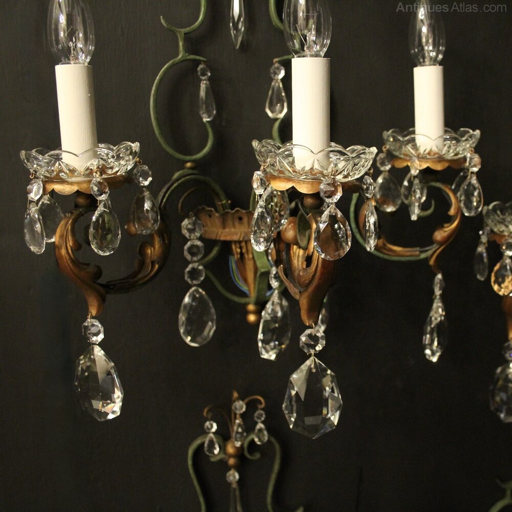 A lovely set of 4 French polychrome wrought iron triple arm antique wall lights, the ornate gilded toleware leaf scrolling arms with leaf and glass bobeche drip pans, issuing from an open green and gilt wrought iron shield backplate, decorated overall with faceted crystal pendants, great scale and very decorative with original gilded and green painted patination. Fully rewired and PAT tested. All our wall lights come with aged brass screws or brackets for fixing and spare bulbs.