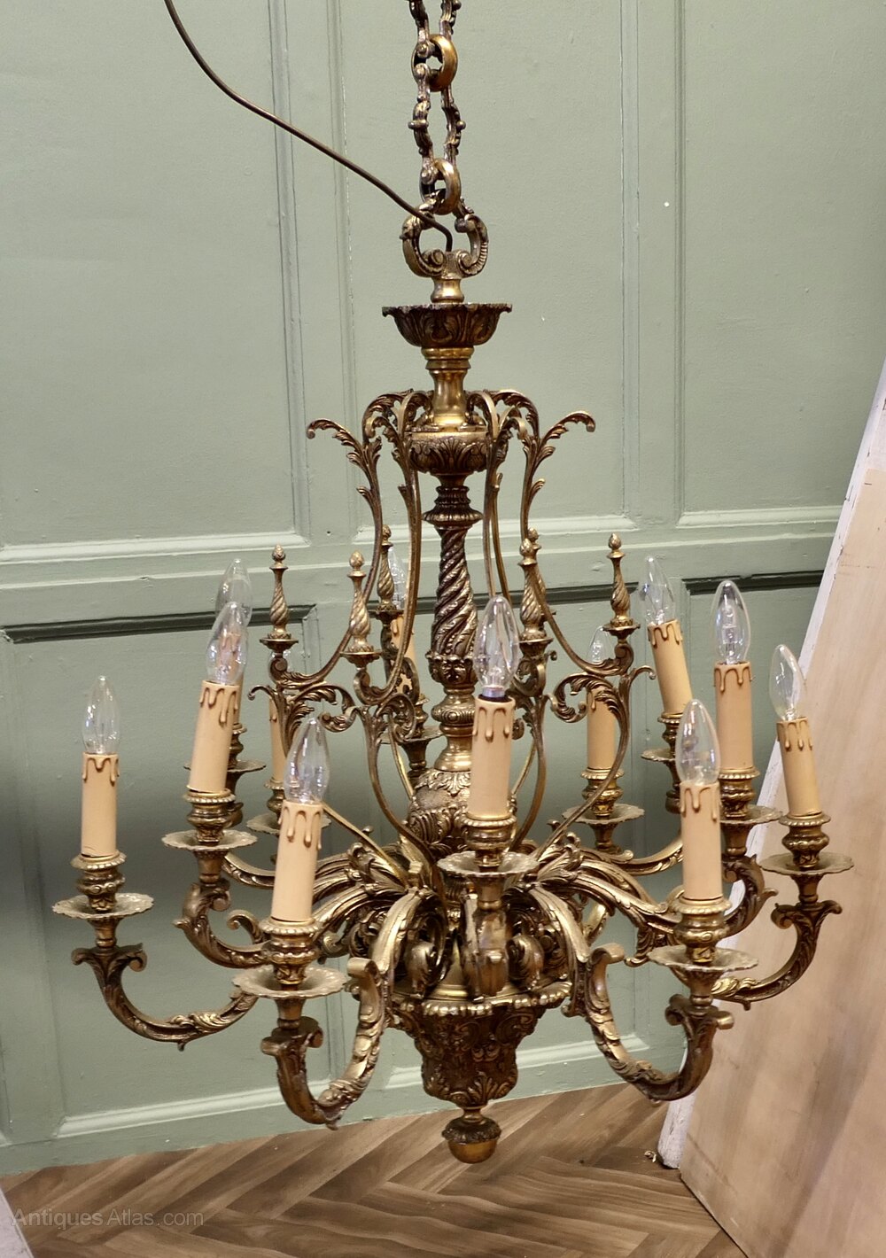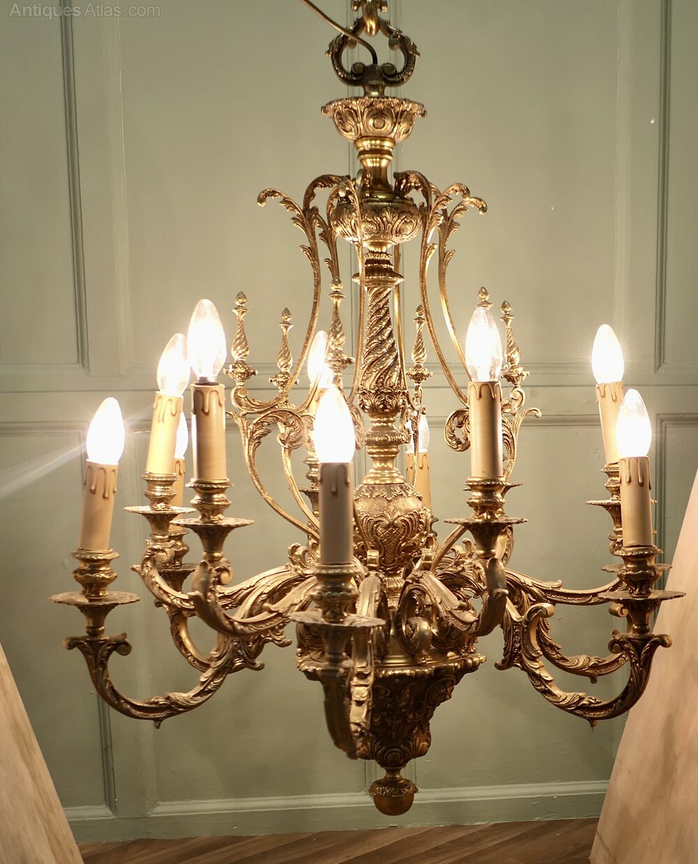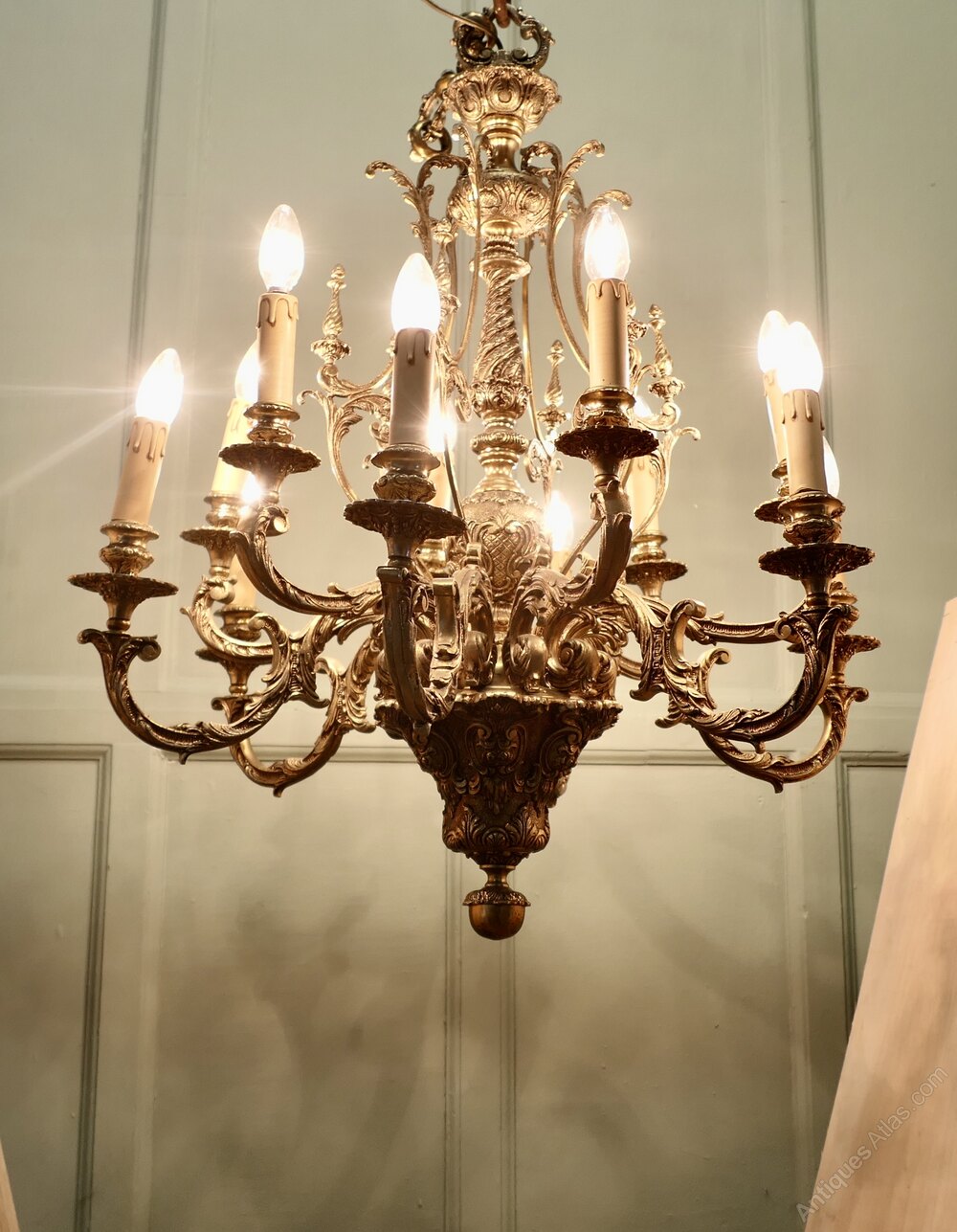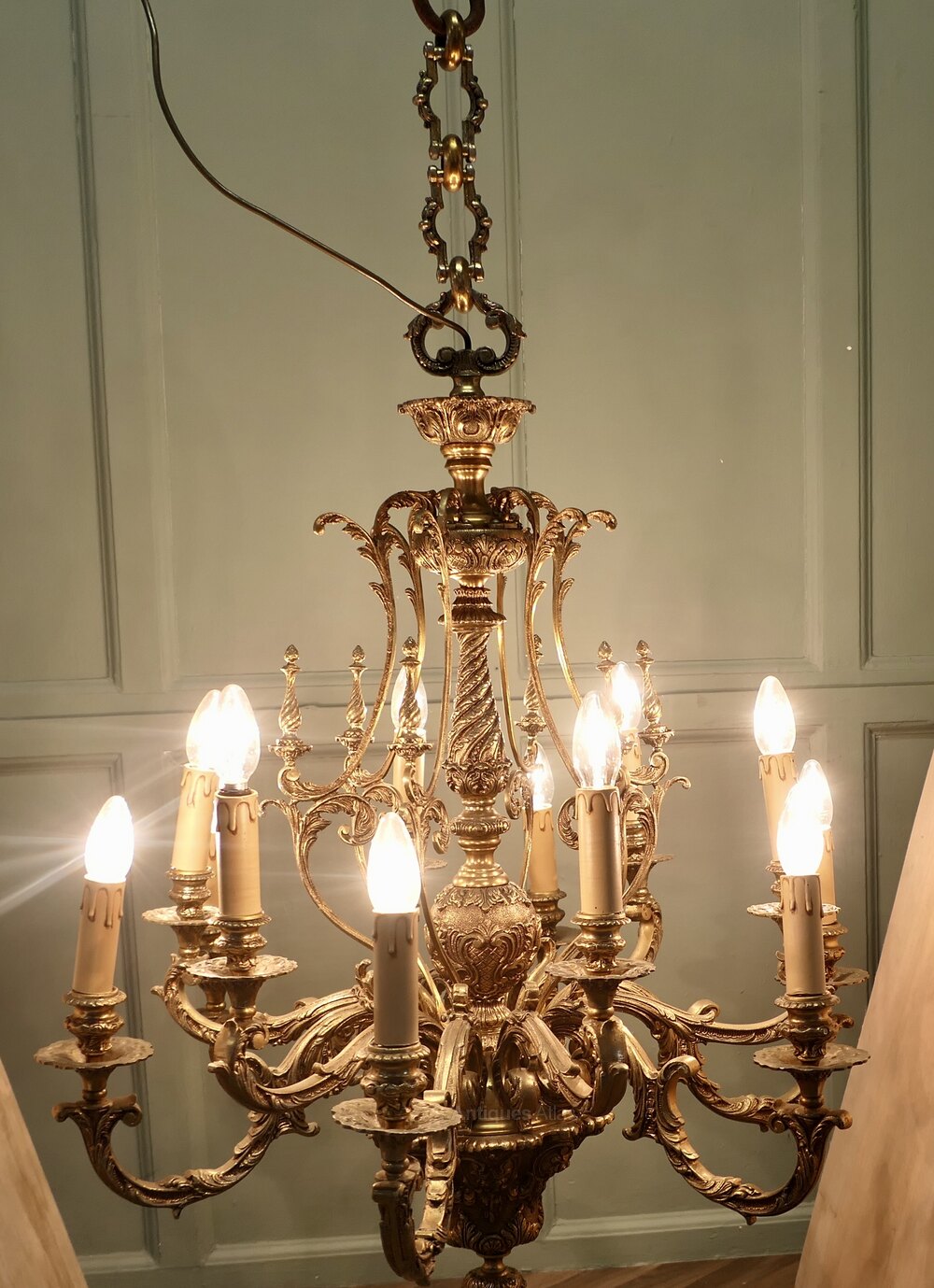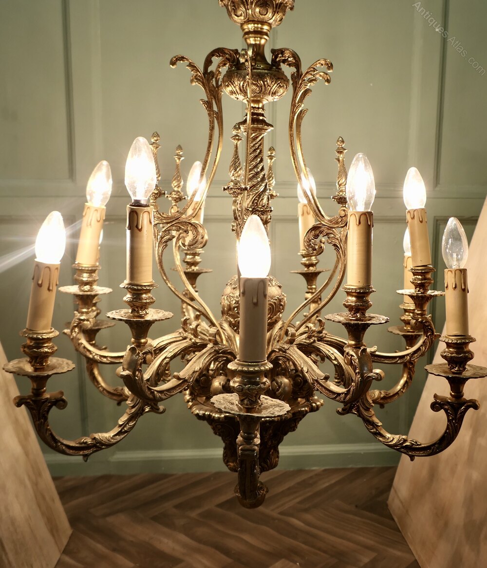 This splendid very large Chateau chandelier is made in Gilded Brass with twelve upward curved arms radiating from an elaborate central baluster column. The chandelier decoration is made up from intricate twists and leaf shapes.