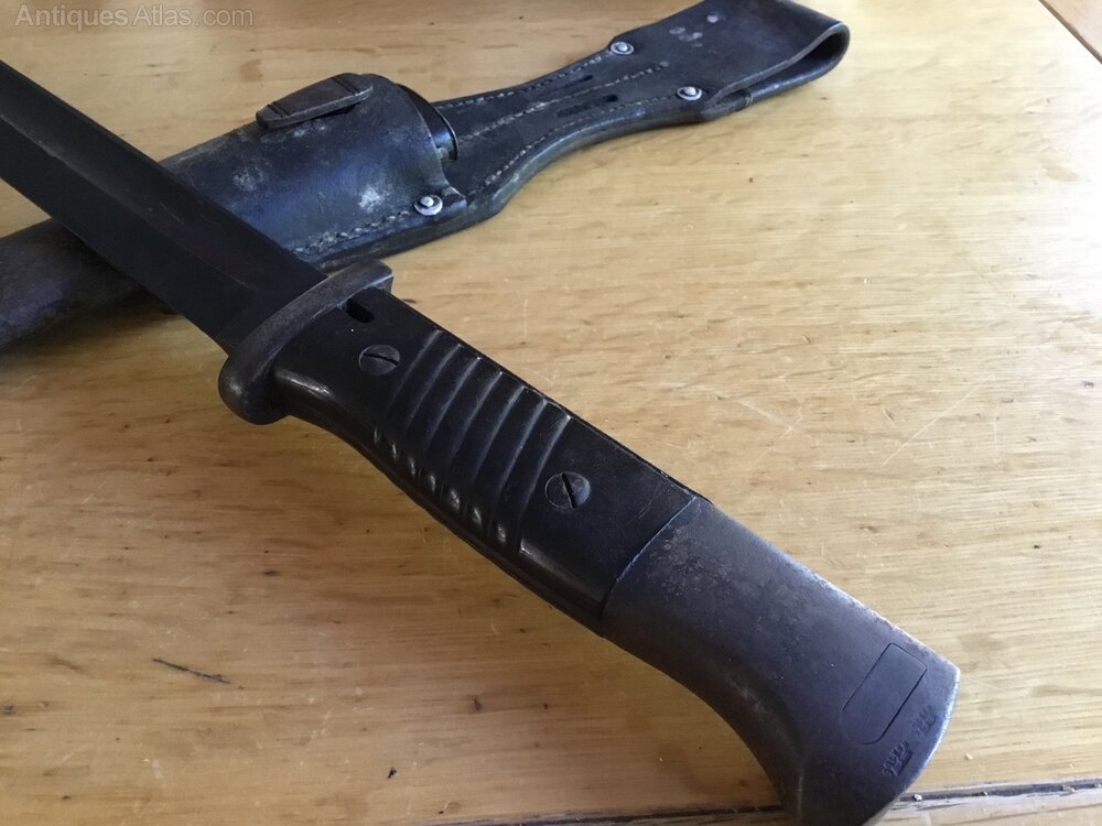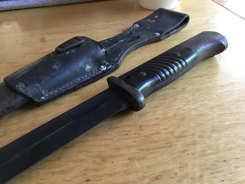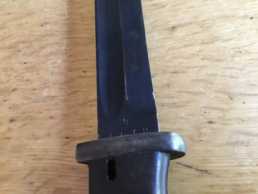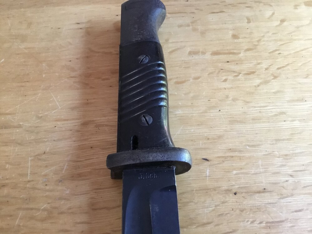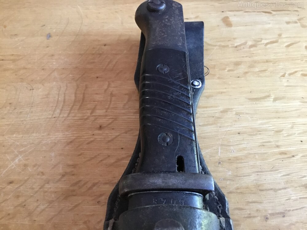 German full matching numbers World War 2 K98 bayonet with frog , blade still has most of the original bluing ,J. Schu number 8709 fully matching to scabbard number to reverse of blade letter b