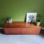 A double-width G Plan Form Five base cabinet in shimmering teak with sliding doors. Set on a recessed plinth, the cabinet has a lightness and simple elegance, inspired by mid century Danish design. Ideal as a low sideboard, or stylish media cabinet, with room on top for your TV, and inside for vinyl LP records. Inside, the cupboard has 2 sections.