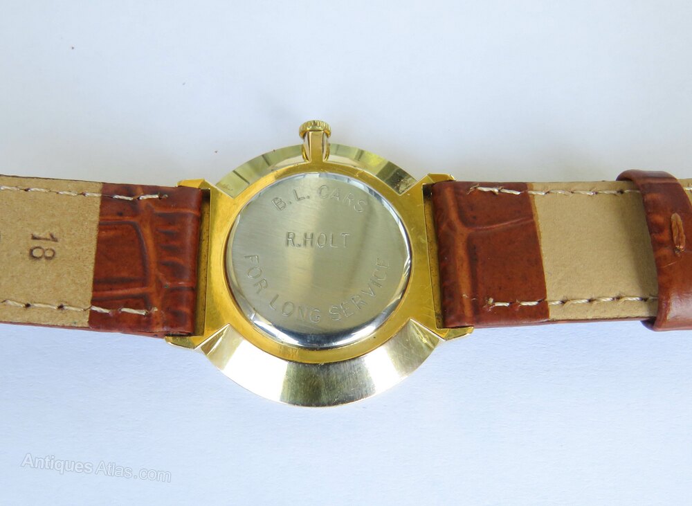 The watch measures 33.5mm diameter excluding the winding crown and the lugs. The case is gold plated and the case back is stainless steel. It is in lovely condition. The back of the watch has a long service inscription from British Leyland. The case is in lovely condition, as is the lens.