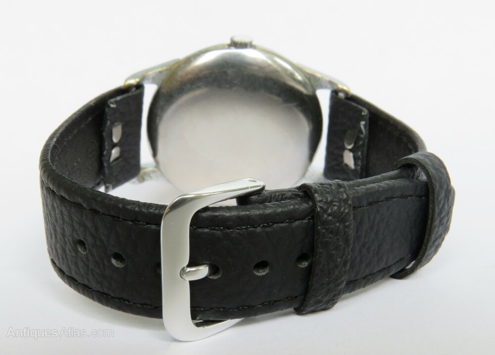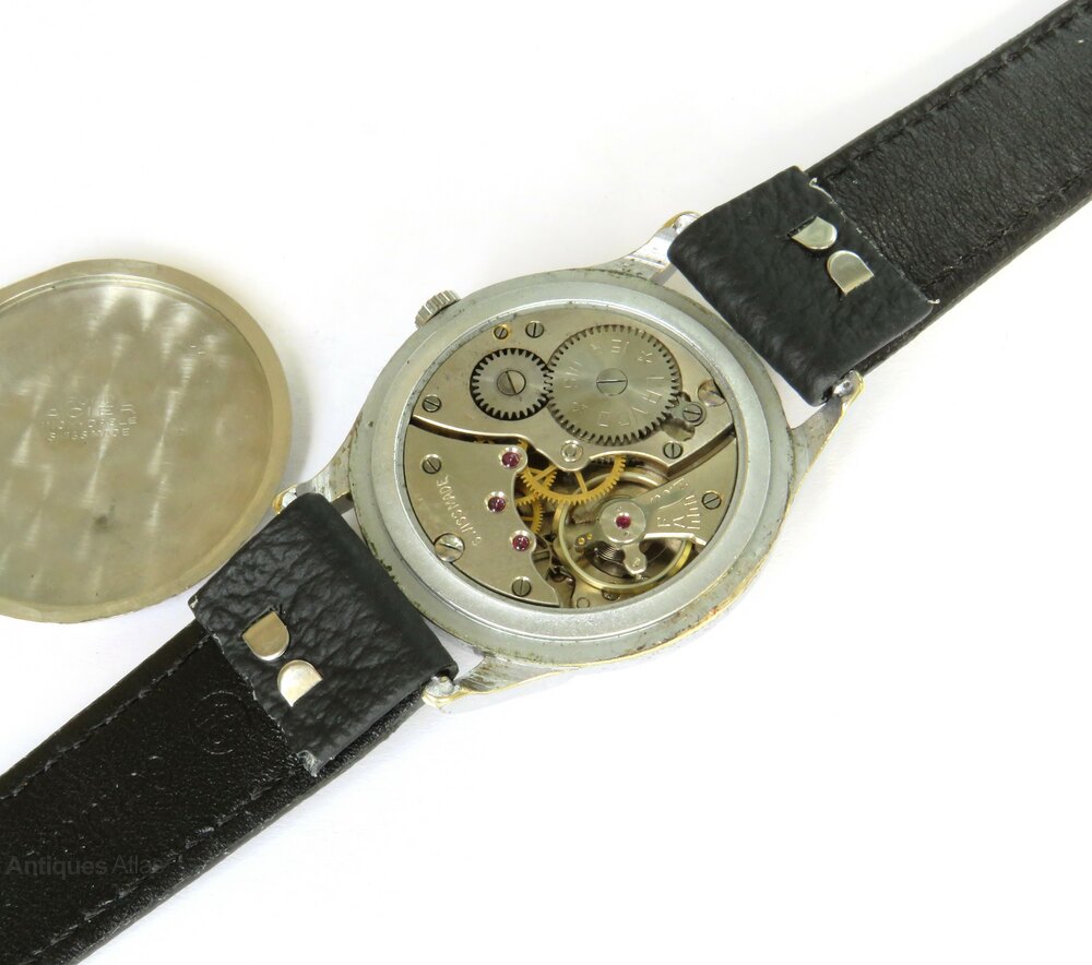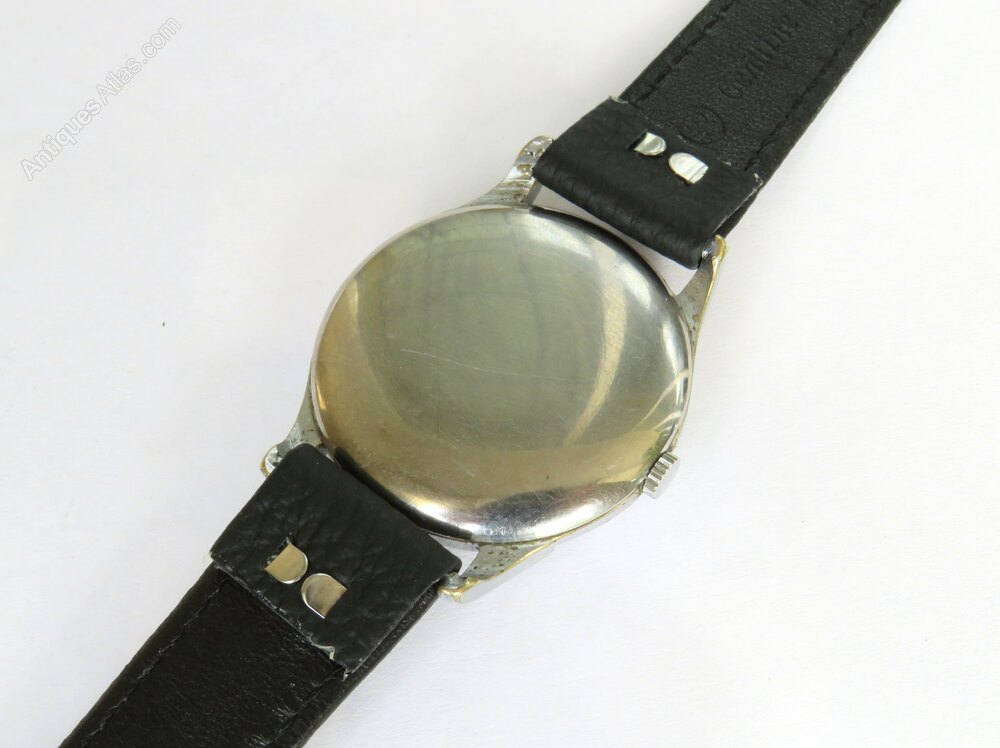The watch measures 34.5mm diameter excluding the winding crown and the handsomely shaped lugs. The case is chromium plated and the case back is stainless steel. There is wear and marking to the plate all commensurate with its age.