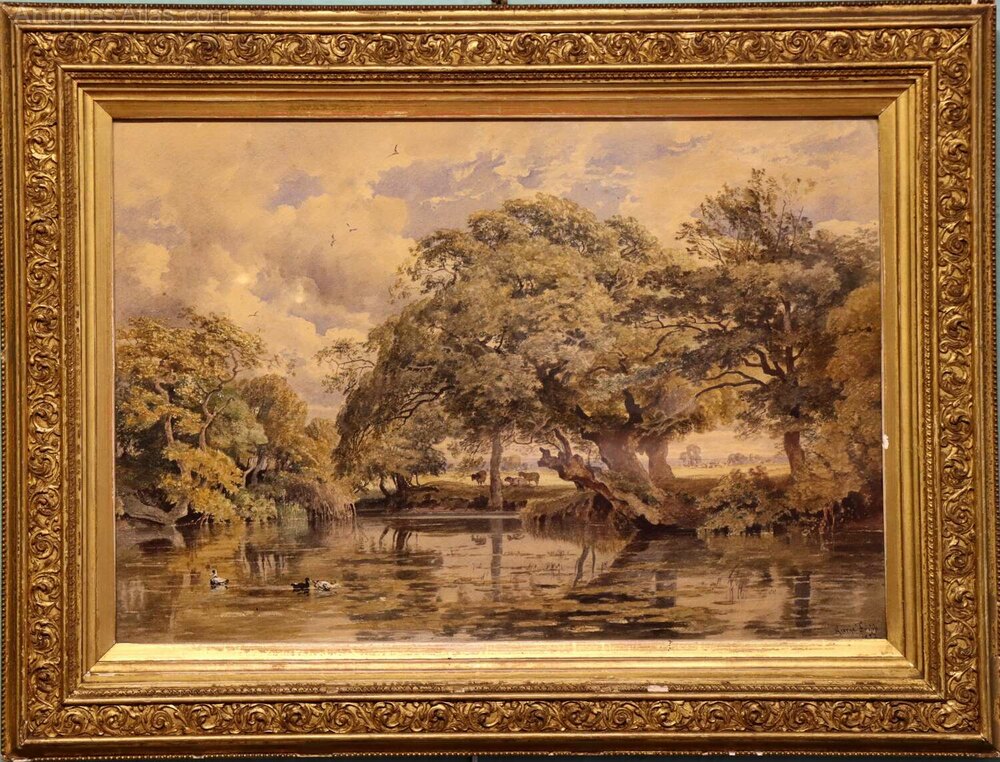 A fine 19th century watercolour landscape by George Fripp, R.W.S., depicting a tranquil wooded river scene with cattle grazing in the distance and ducks on the water in the foreground. Signed and dated lower right George Fripp 1852. Presented in its original gilt moulded frame.