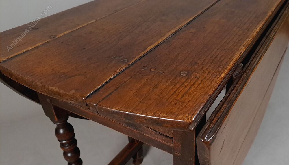 The top comprises seven original boards. Three narrower boards form the table bed and each leaf comprises two substantial well shaped biscuit jointed boards. One of the boards to the bed has shrunk a little over time and a slight gap formed but nothing untoward. This would have shrunk in the first 50 years after the table was made and will not move further. The gap is part of the table’s history and a testament to its great age.