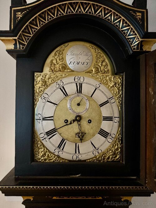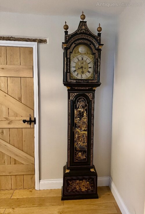 Fantastic quality antique George III lacquered and chinoiserie decorated longcase clock, having a quality brass arched dial, the arch with a name plate signed Jacob Ellry Rumsey surrounded by heavily ornate detailing, with a silvered chapter ring with Roman and Arabic numerals and the original ornate hands, having an eight day movement striking the hour and half hour on a bell, having the original weights, pendulum and key, in a superb quality lacquered case with stunning chinoiserie decoration throughout.