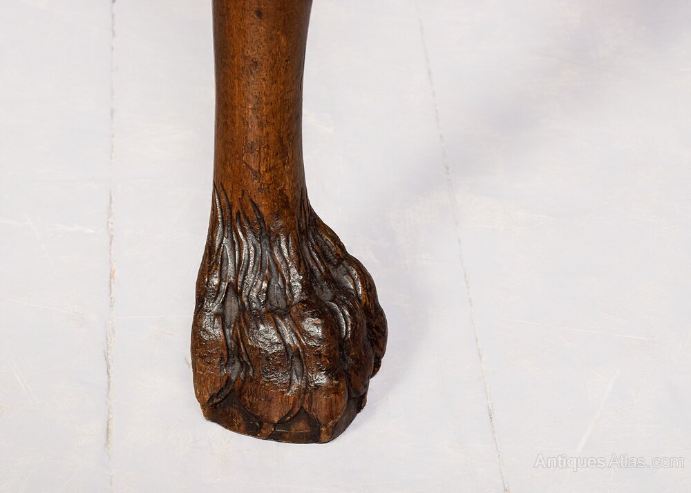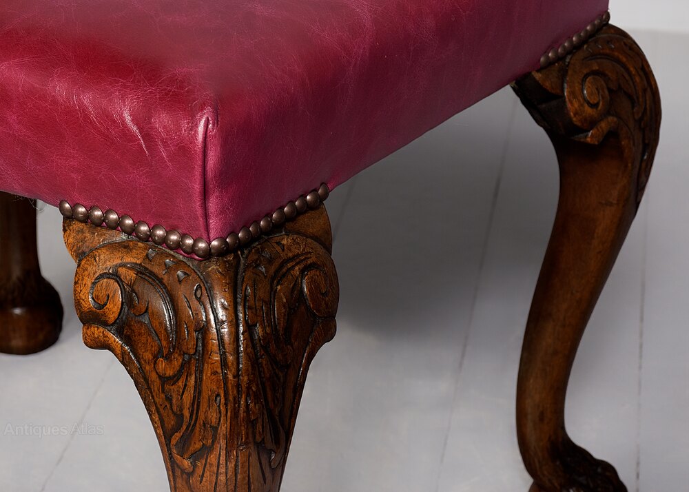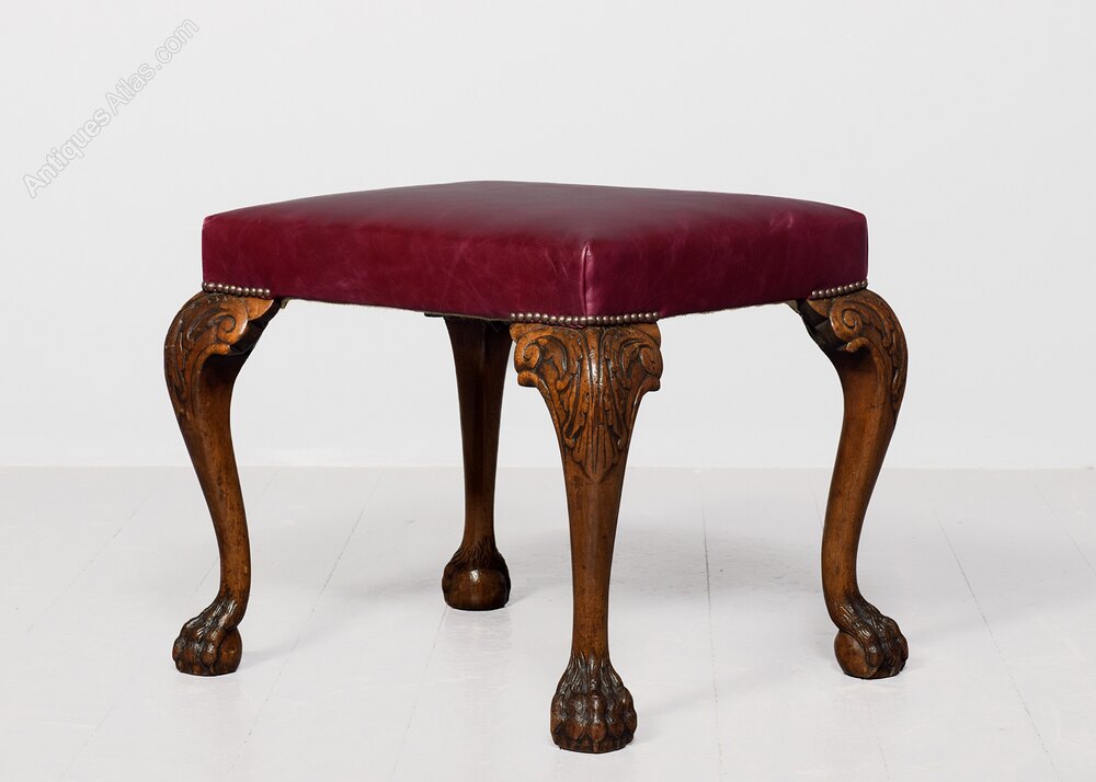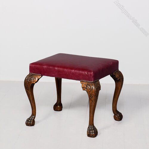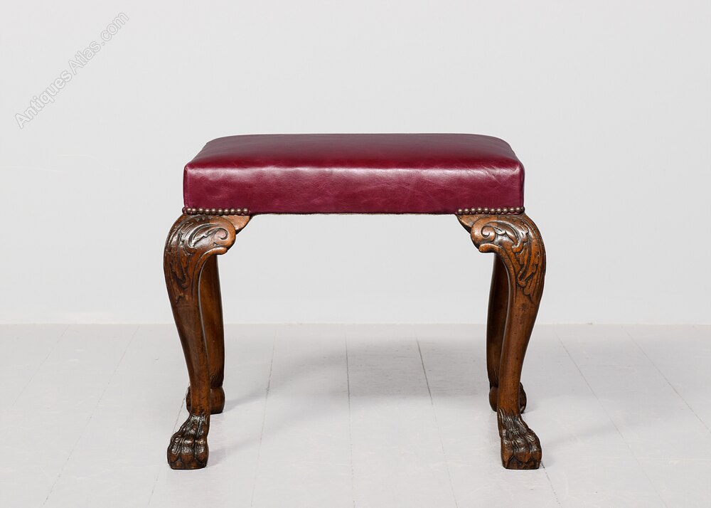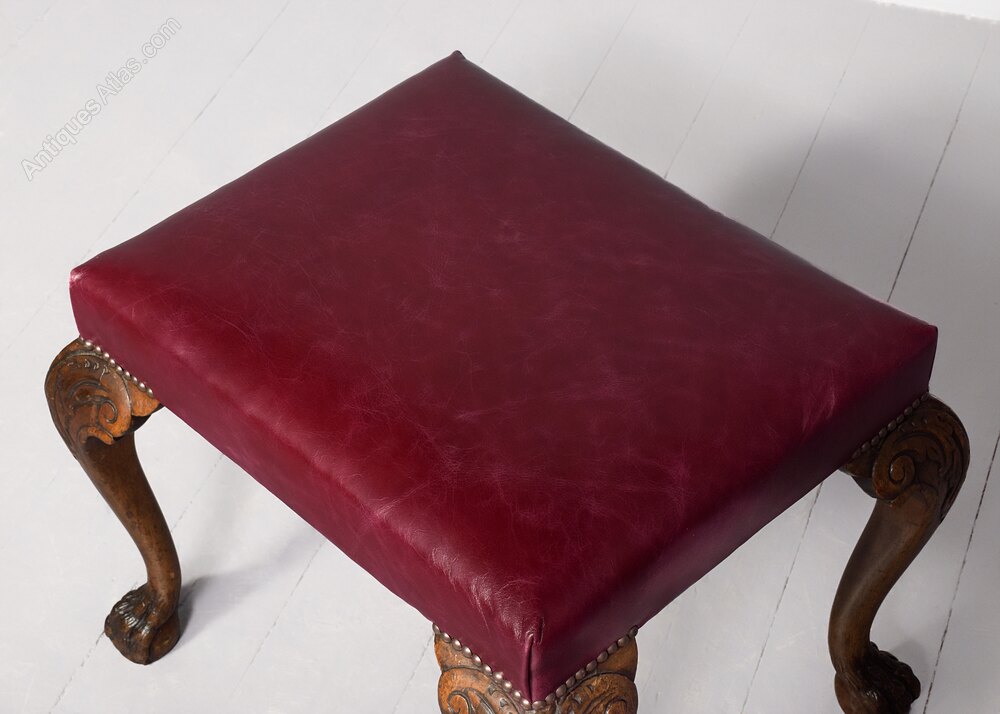 Circa 1800. George III style rectangular stool, the top upholstered in a quality burgundy hide with brass studding. Standing on cabriole legs with acanthus carved knees and quarter blocks, finishing in a stylish hairy paw foot clasping a ball. Good colour and patination.