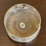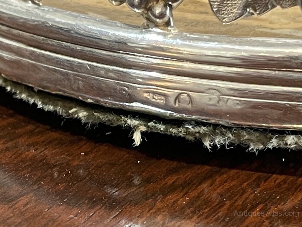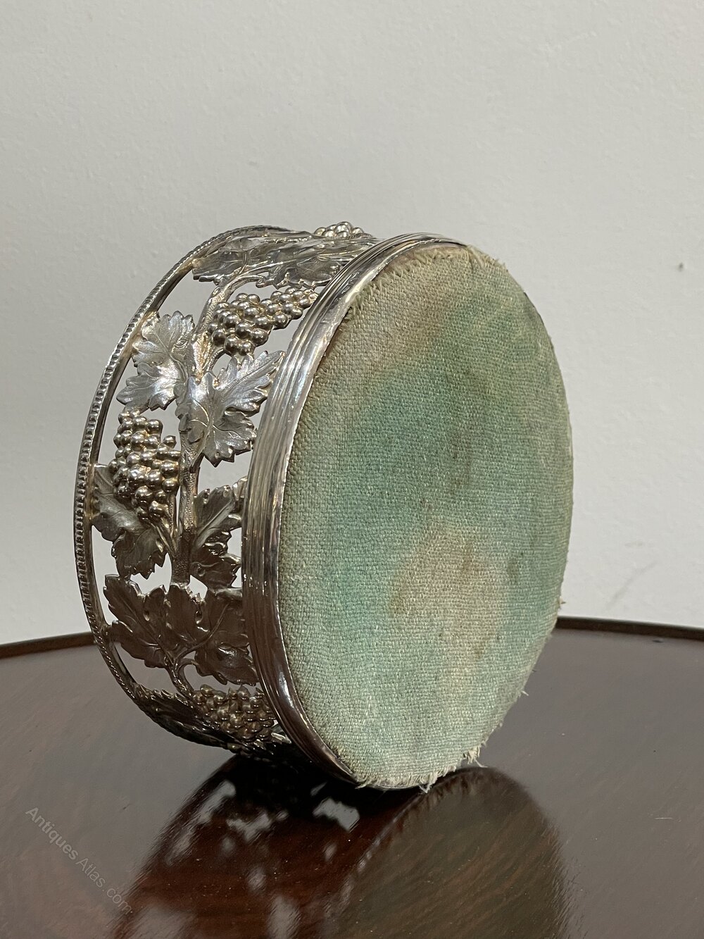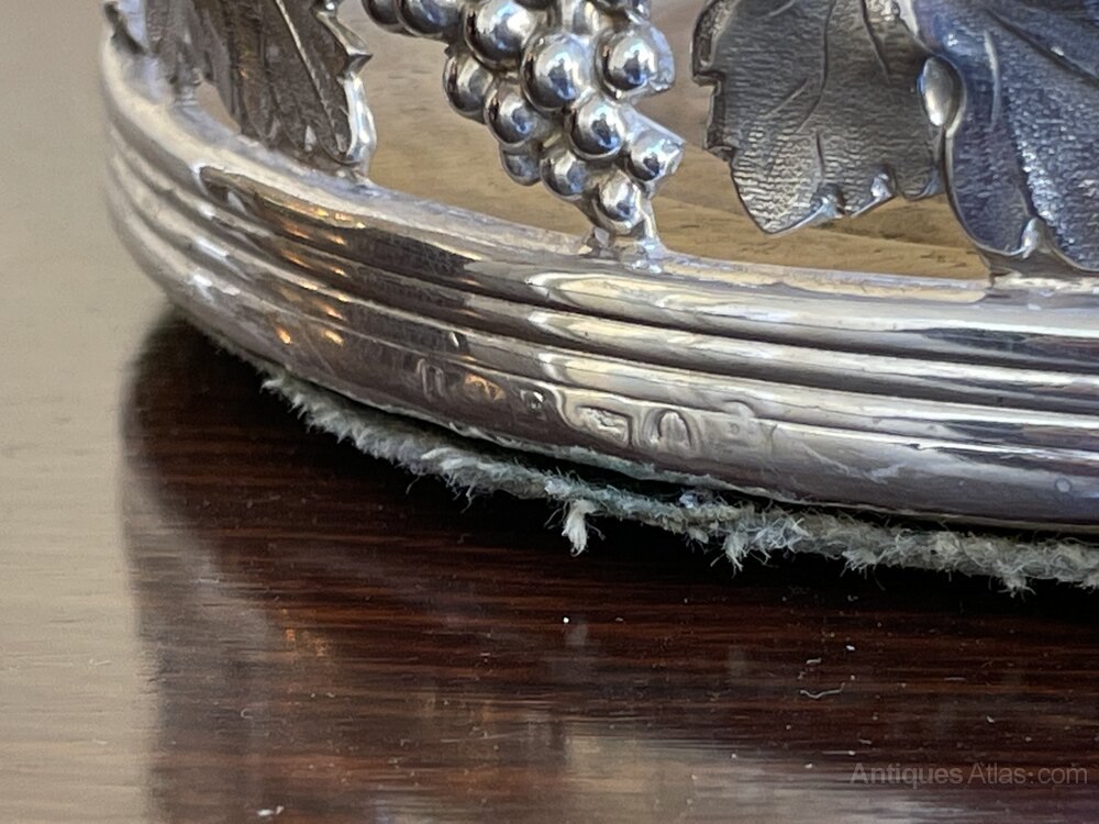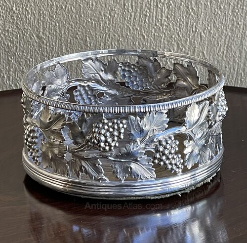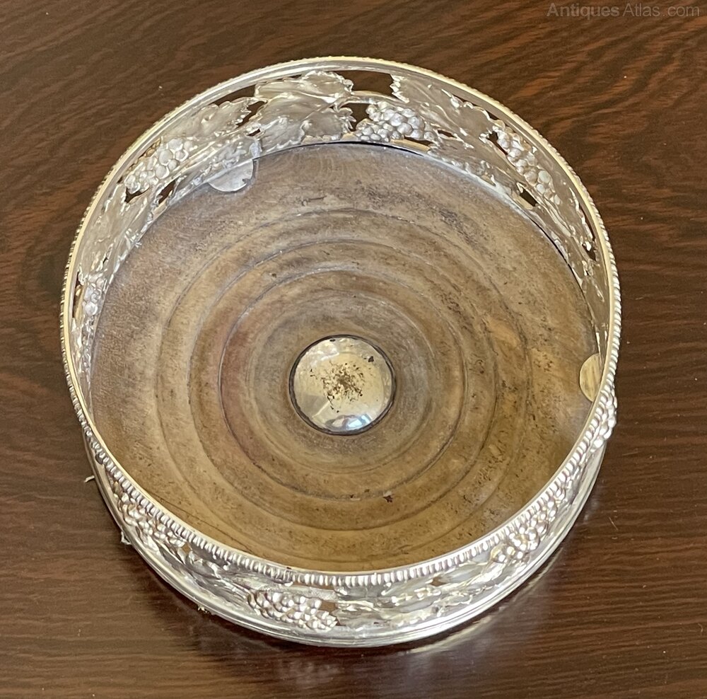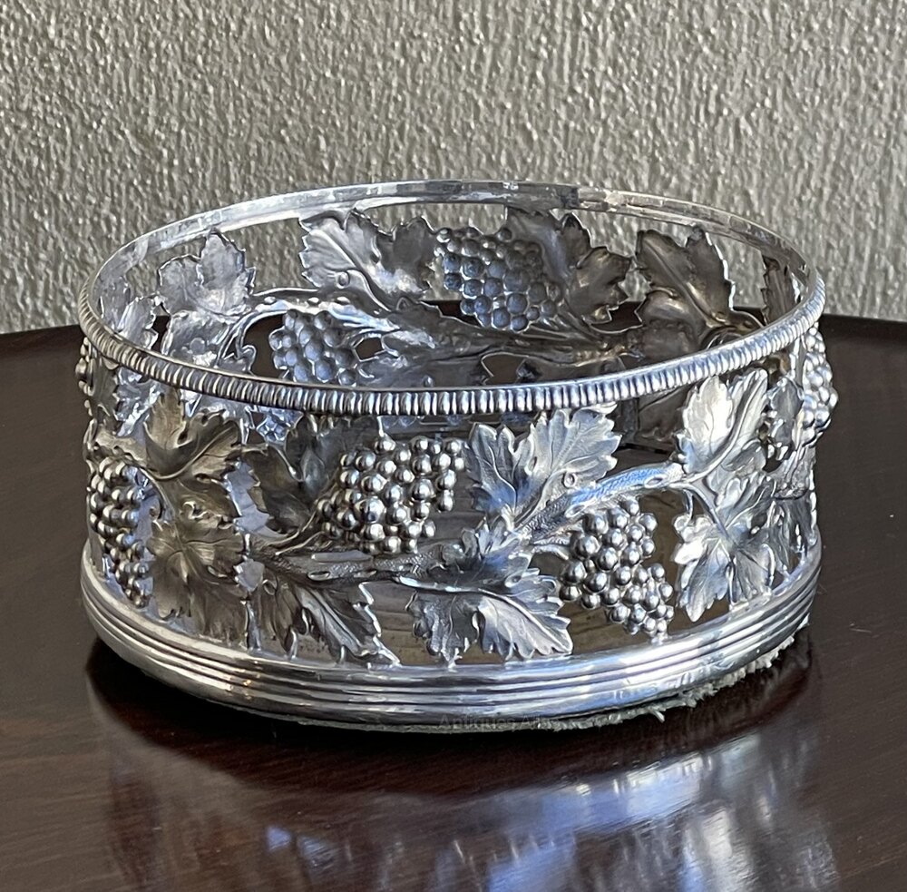 A very fine early 19th century cast silver wine coaster decorated with grape and vine decoration gadroon border set into a turned circular wood base. Unfortunately the hallmarks are very rubbed. We can decipher enough to establish this was made in Sheffield circa 1828-1830 and almost certainly by T Settle & Gunn & Co.