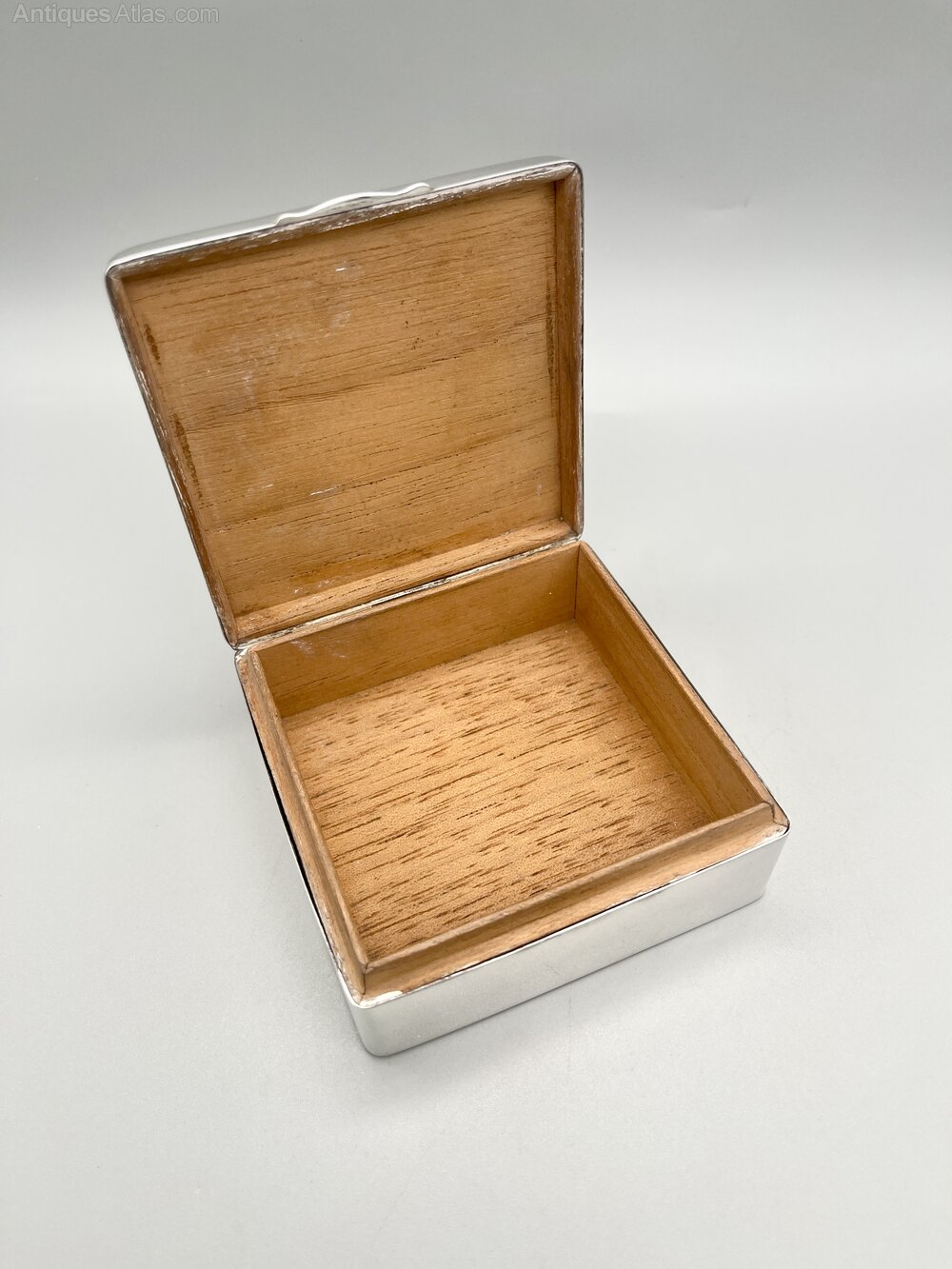 This is a smart George V Sterling Silver Cigarette Box with a Cedar Wood lining. The box is square with a plain smooth lid and sides. The underside of the base has a thin leather covering.
