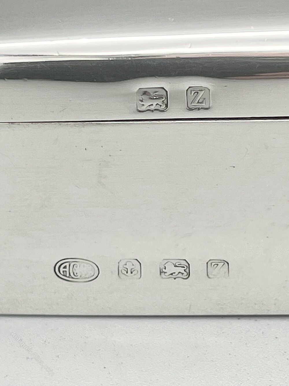 The hallmarks, on the side of the box, are a little rubbed but still clear to read. They show the lion passant for Sterling Silver, the anchor assay mark for Birmingham, the date letter z for 1924 and the distinctive oval A C & Co Ld makers' mark for The Alexander Clark Co Ltd. The underside is also stamped with the retail mark Alex. Clark Co Ltd London.