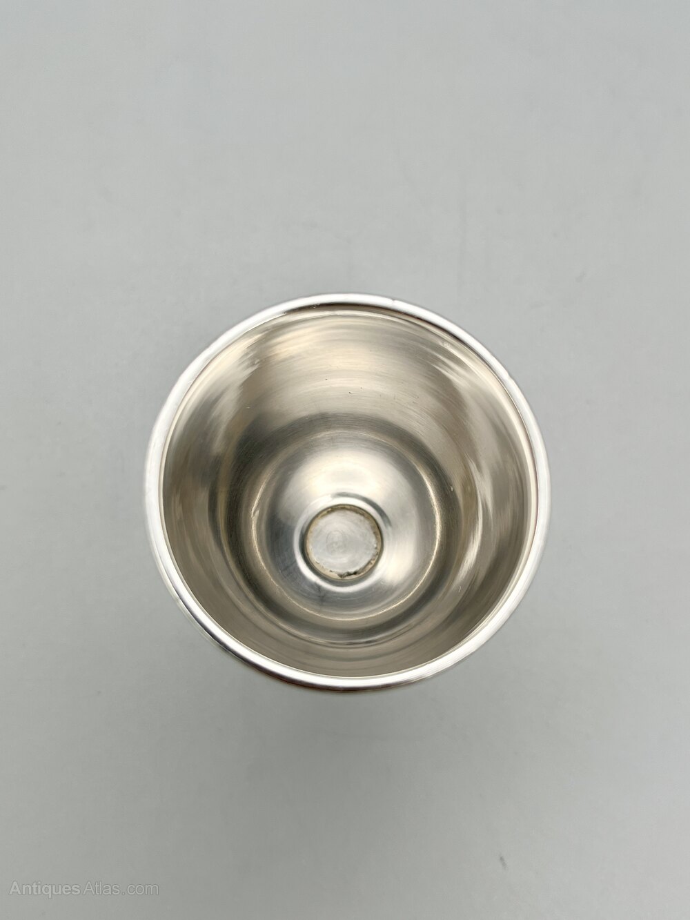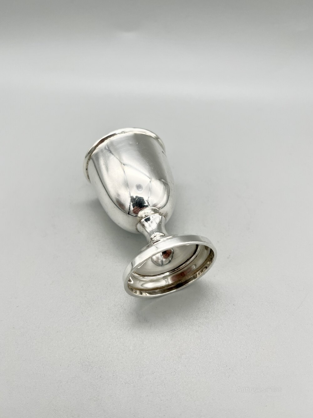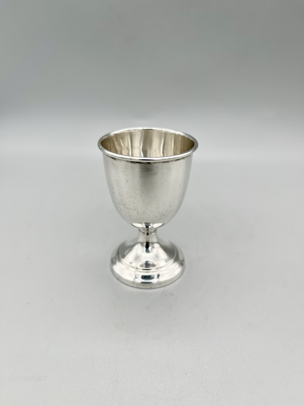 This is a smart George V Sterling Silver Egg Cup. The cup is of classic goblet design with a circular stepped base and a rolled top rim. There are no initials or personalisation of any kind.