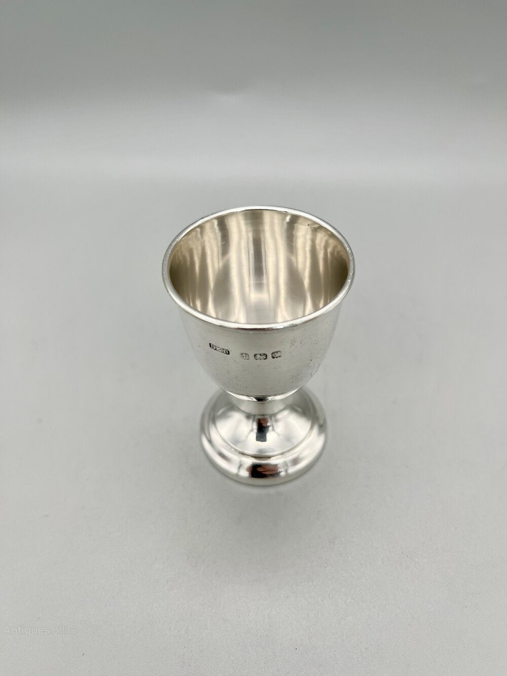 The egg cup stands 6.5cm / 2.5ins high and is 4.2cm / 1.6ins in diameter. It weighs in at a respectable 32.0g / 1.1oz of solid Sterling Silver.
