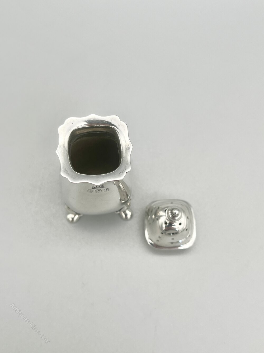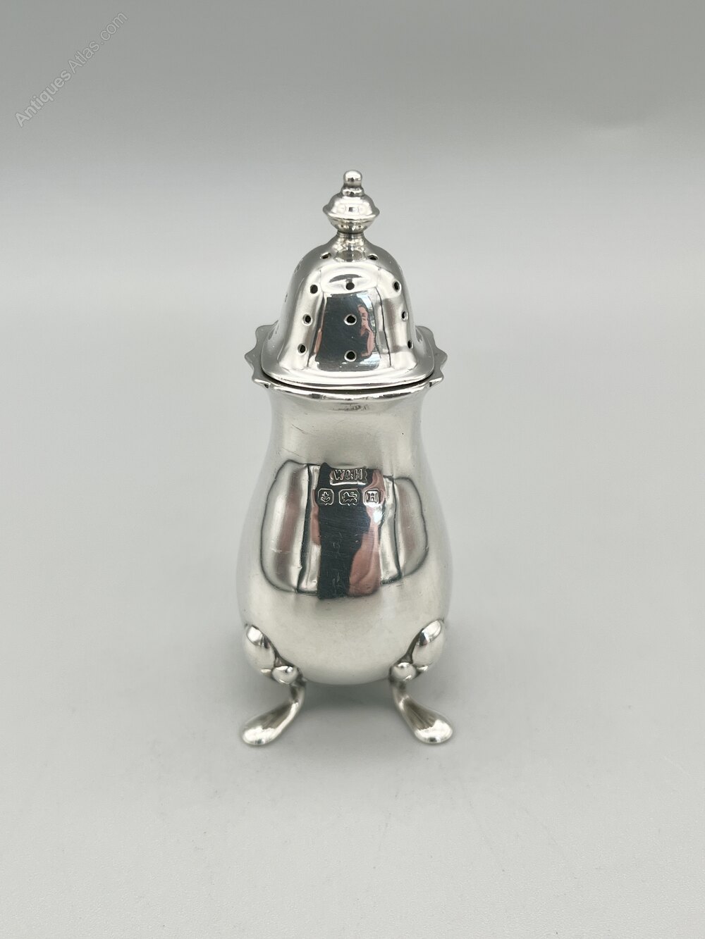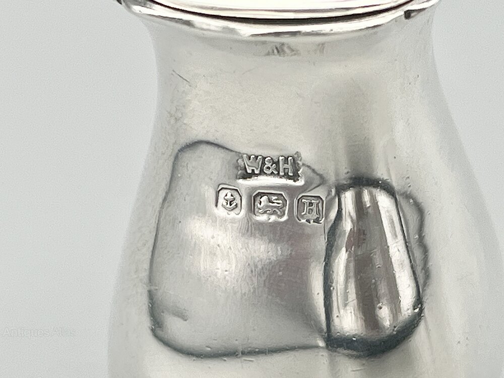 The pepper shaker was made in Birmingham by world famous silversmiths Walker & Hall and dates to 1932. Walker & Hall are one of the great names of English silverware. The firm was founded by George Walker in 1845 with Henry Hall joining in 1853 to form Walker & Hall. Hugely successful and very highly regarded they remained in business until they were merged with Mappin & Webb and Elkington & Co to form British Silverware in 1963.