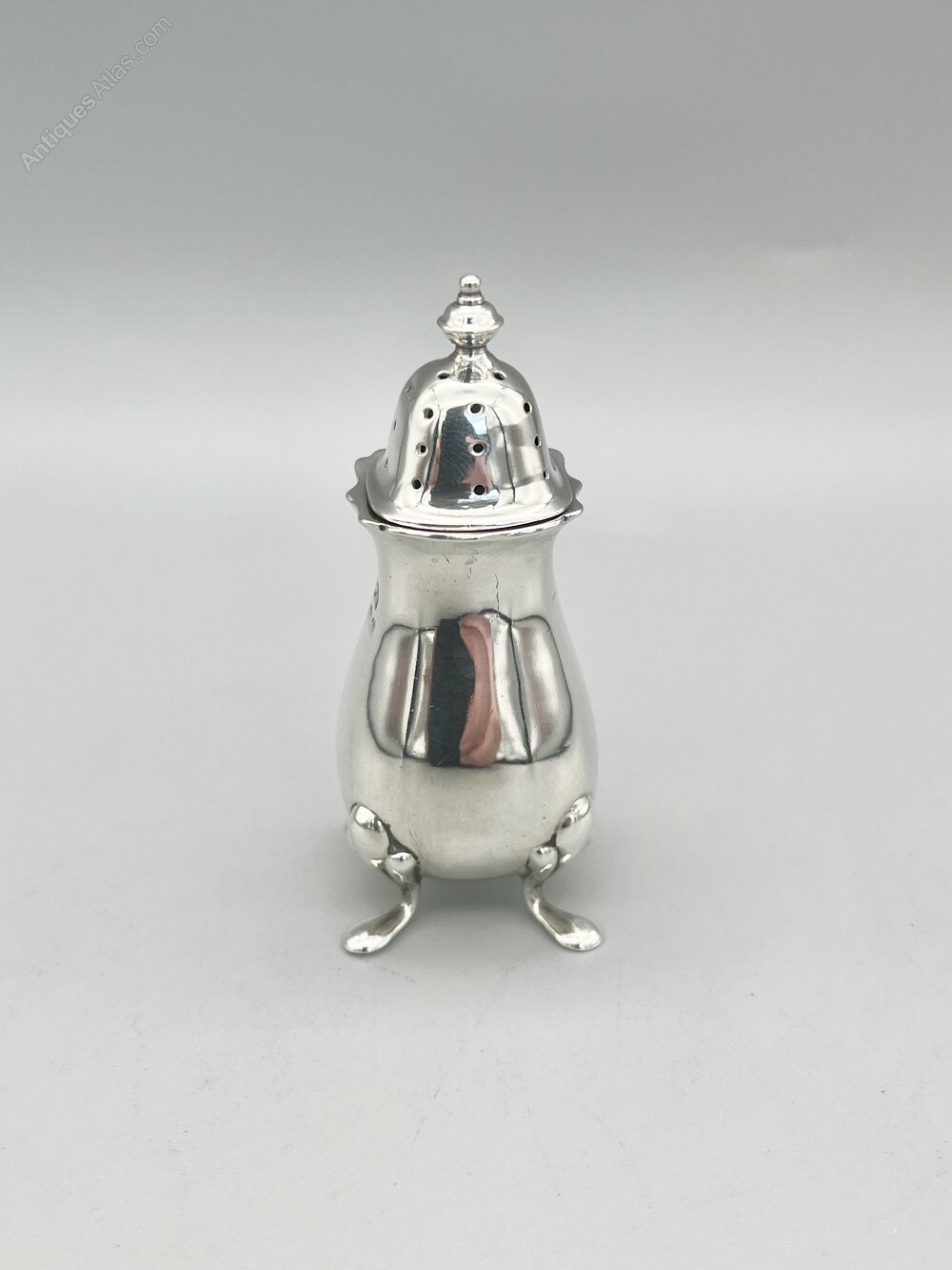 This is a smart George V Sterling Silver Pepper Shaker of traditional form. The shaker stands on four spread feet with a bulbous tapering body and a scalloped top rim. The pull off pierced top has a turned finial. There are no initials or personalisation of any kind.