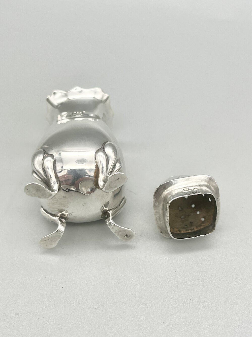 The pepper shaker is 7.5cm / 2.9ins high and 2.8cm / 1.1ins wide. It weighs in at 30.3g / 1.07oz of solid Sterling Silver.