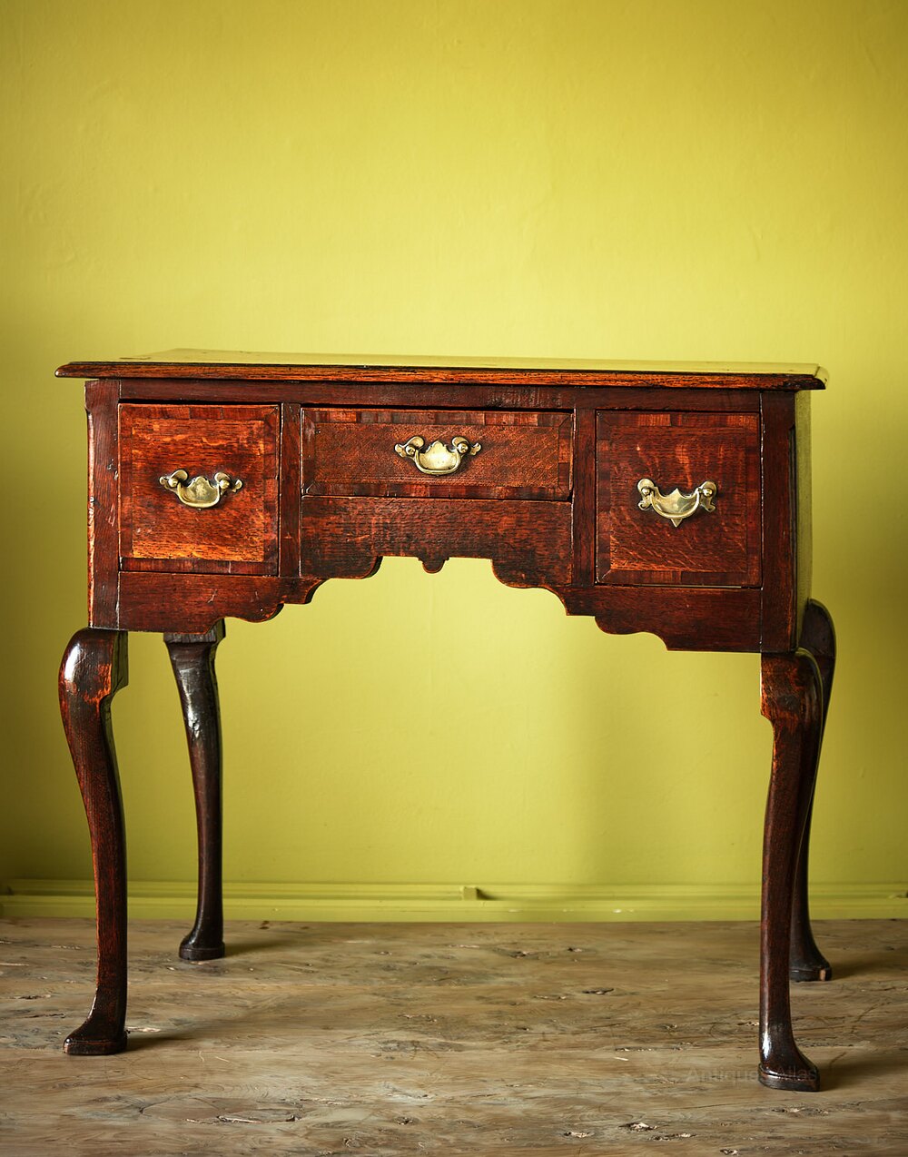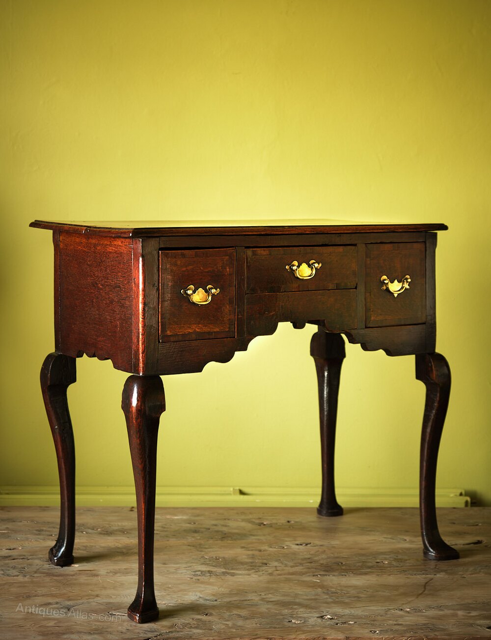 A mid 18th century oak lowboy or sidetable of attractive design, the two plank top has a moulded edge above three short drawers, all with fruitwood crossbanding and brass backplates, most of which are probably original. The outer corners have rounded chamfers.