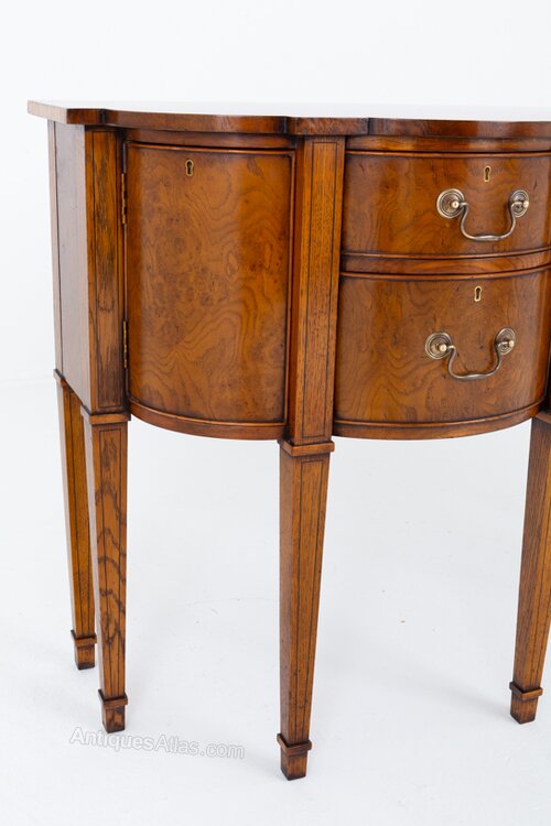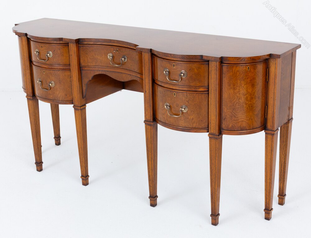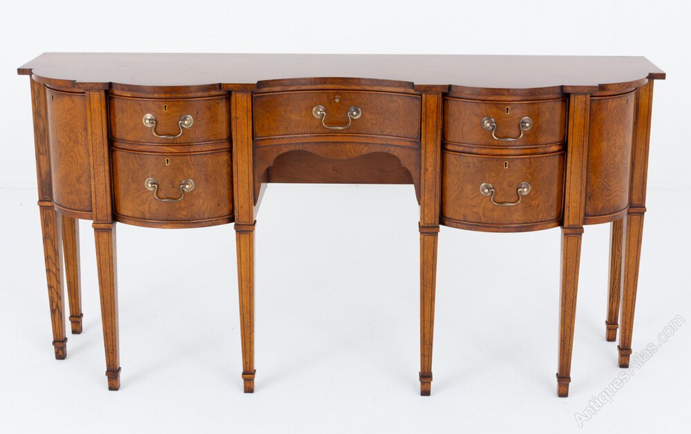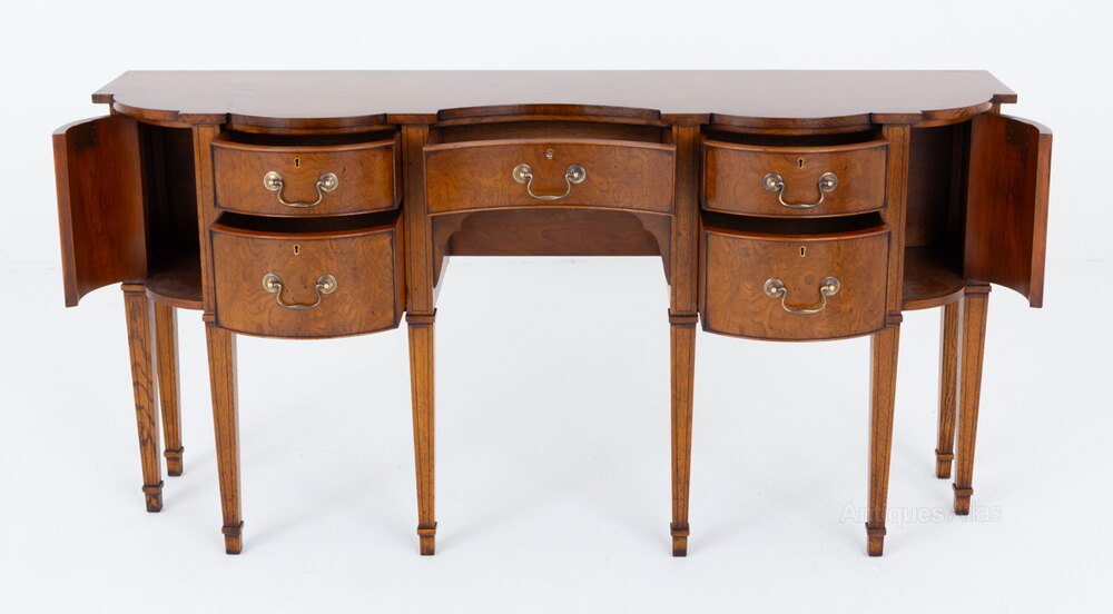 The Sideboard Features 5 Oak Lined Drawer with Brass Swan Neck Handles which are Flanked By Shaped Cupboards.