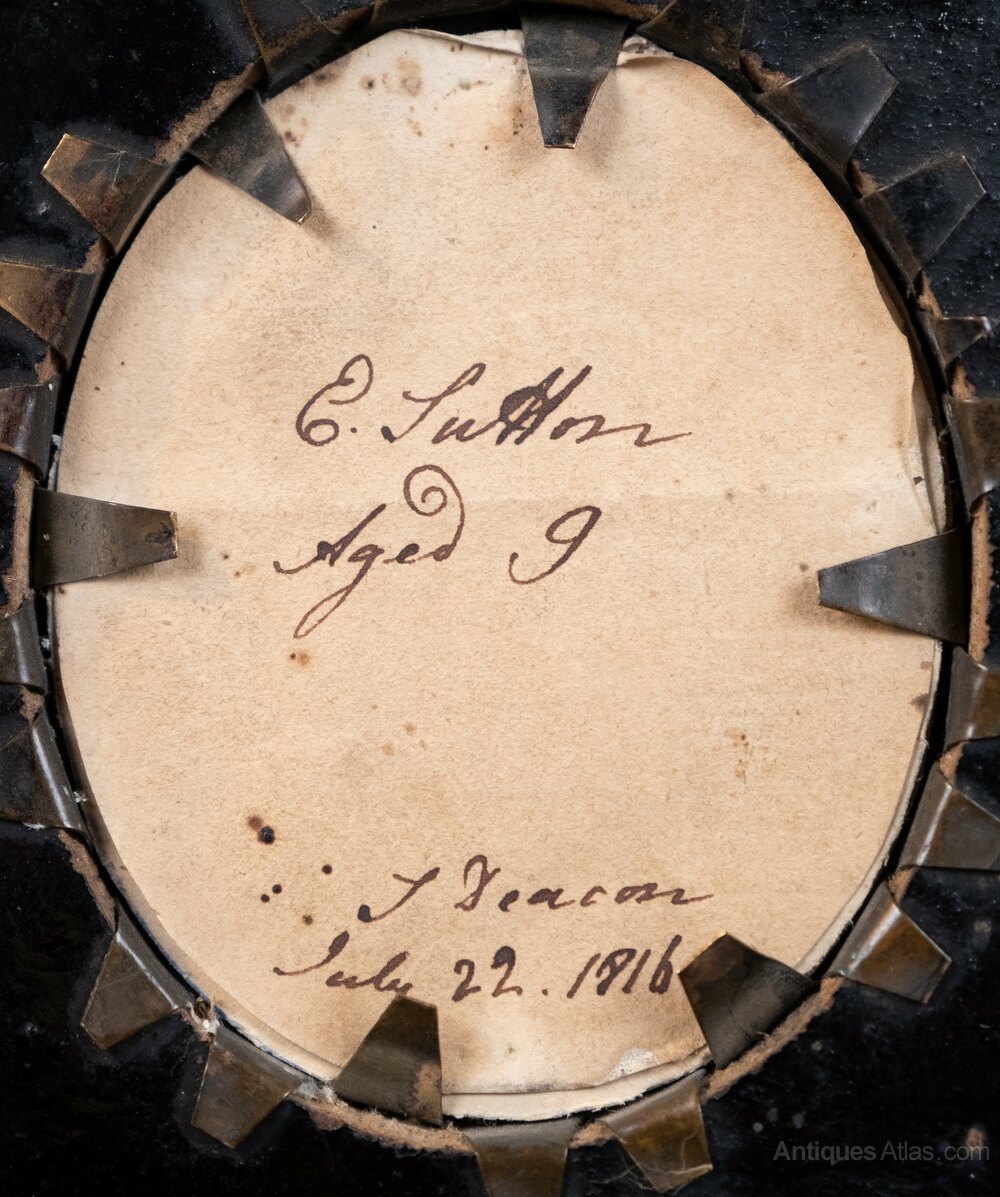 A charming Regency period bronzed silhouette portrait, identified verso as 'E Sutton, Aged 9' and signed 'J Deacon, July 22 1816'.