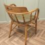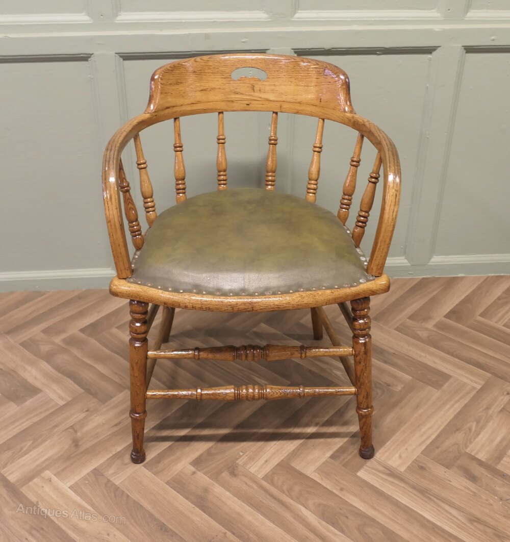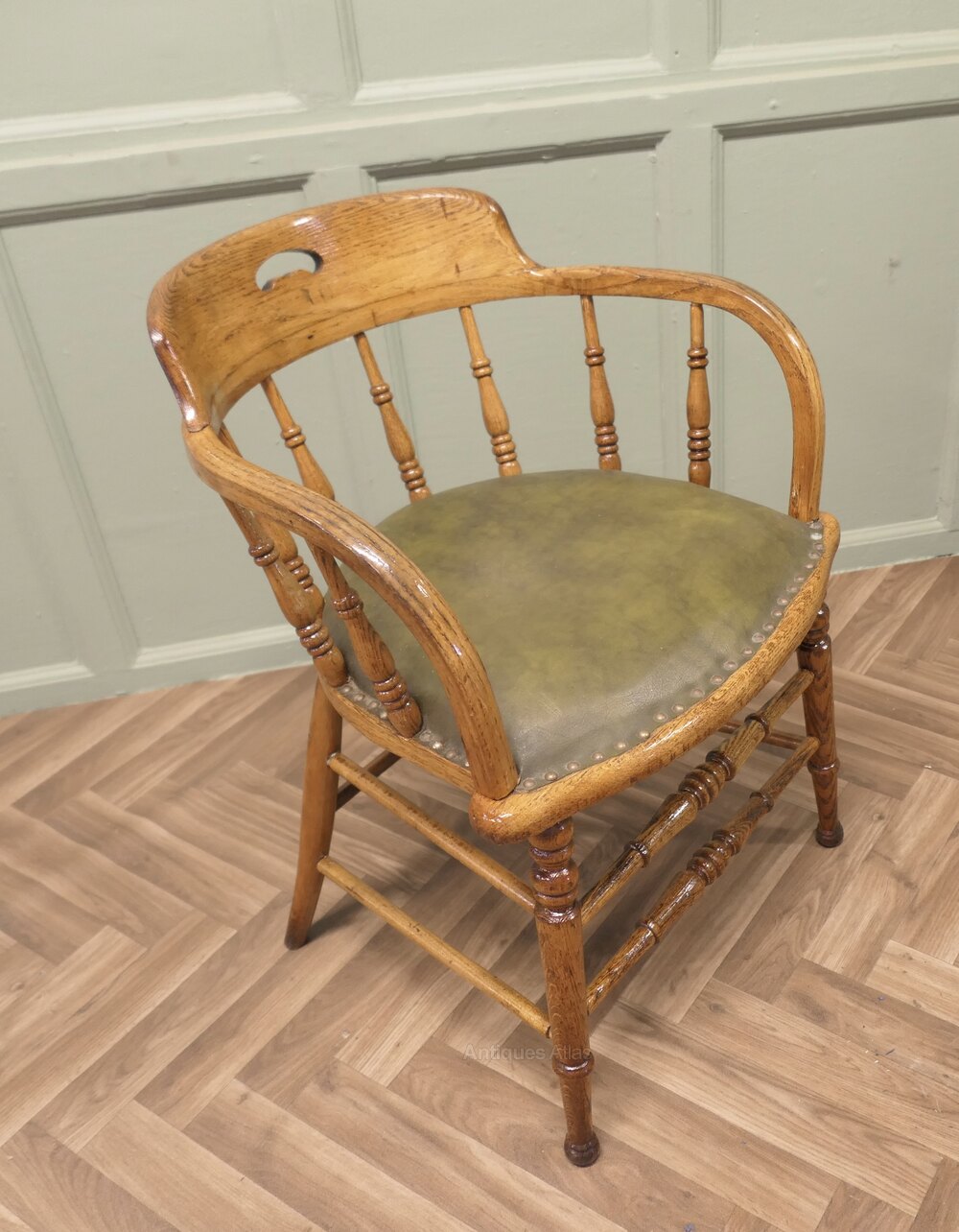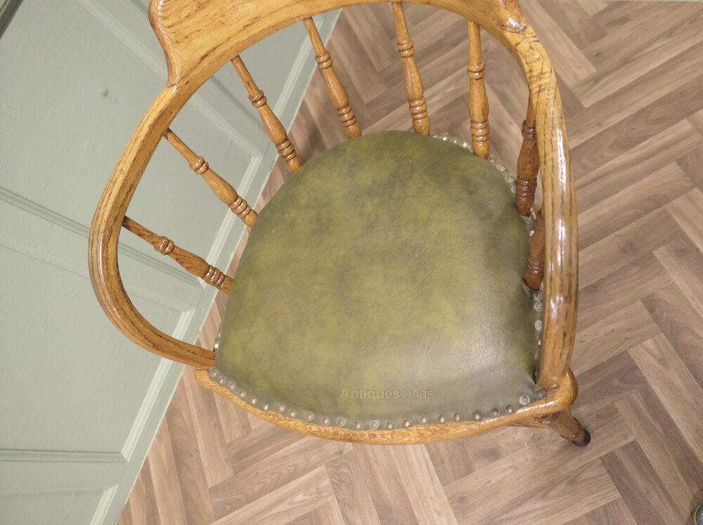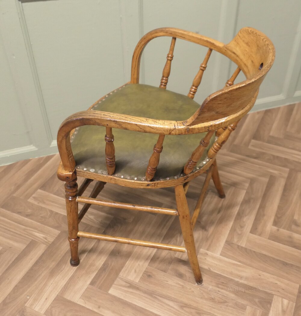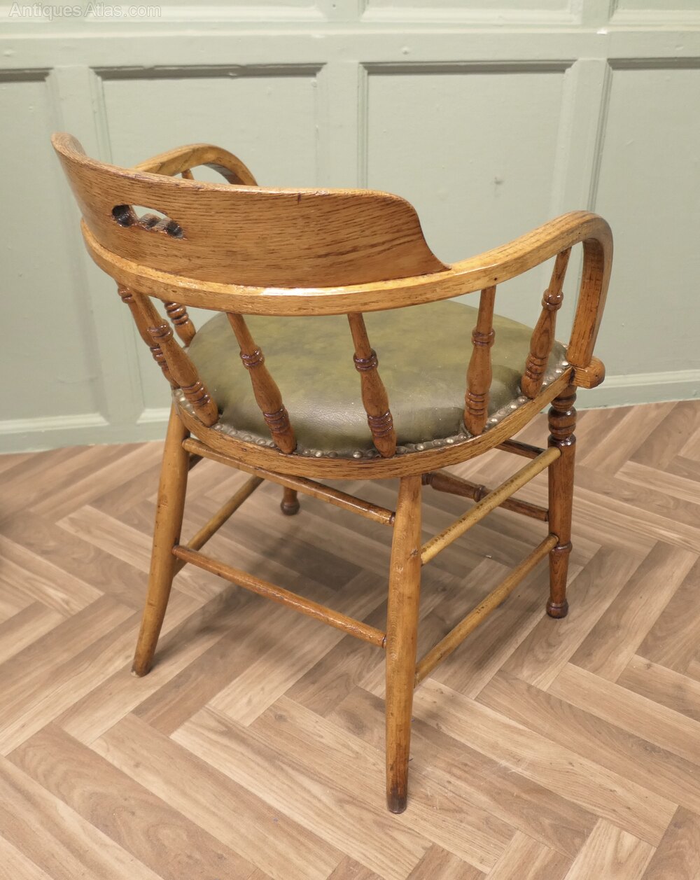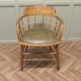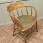 This is a very attractive piece, it is made in Curvy Golden Oak, the back of the chair curves around and the arm rests curve down from there, it is supported by 8 crisply turned spindles. The chair seat is in good used condition.