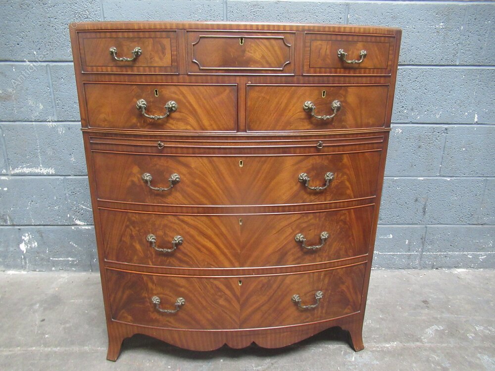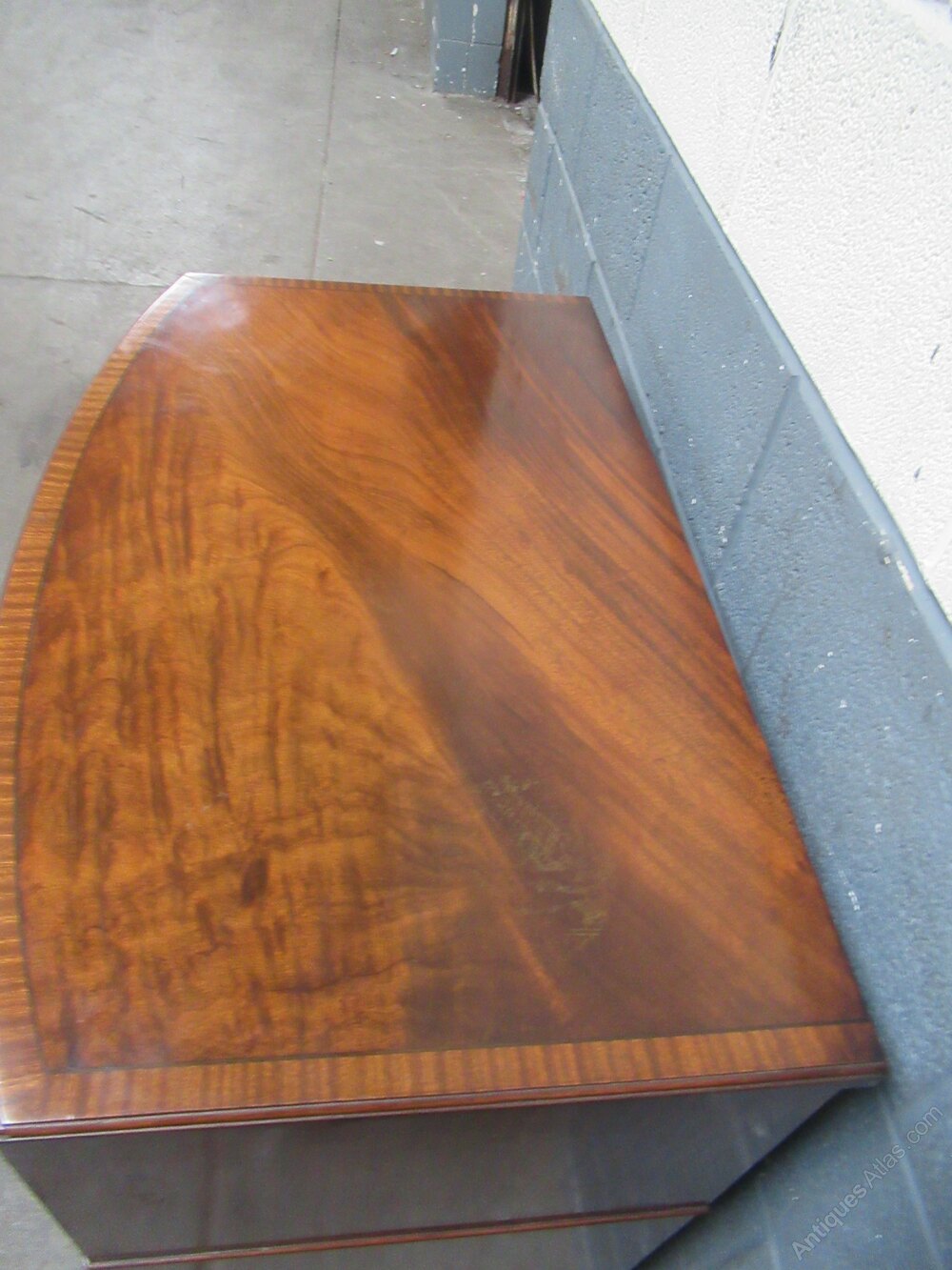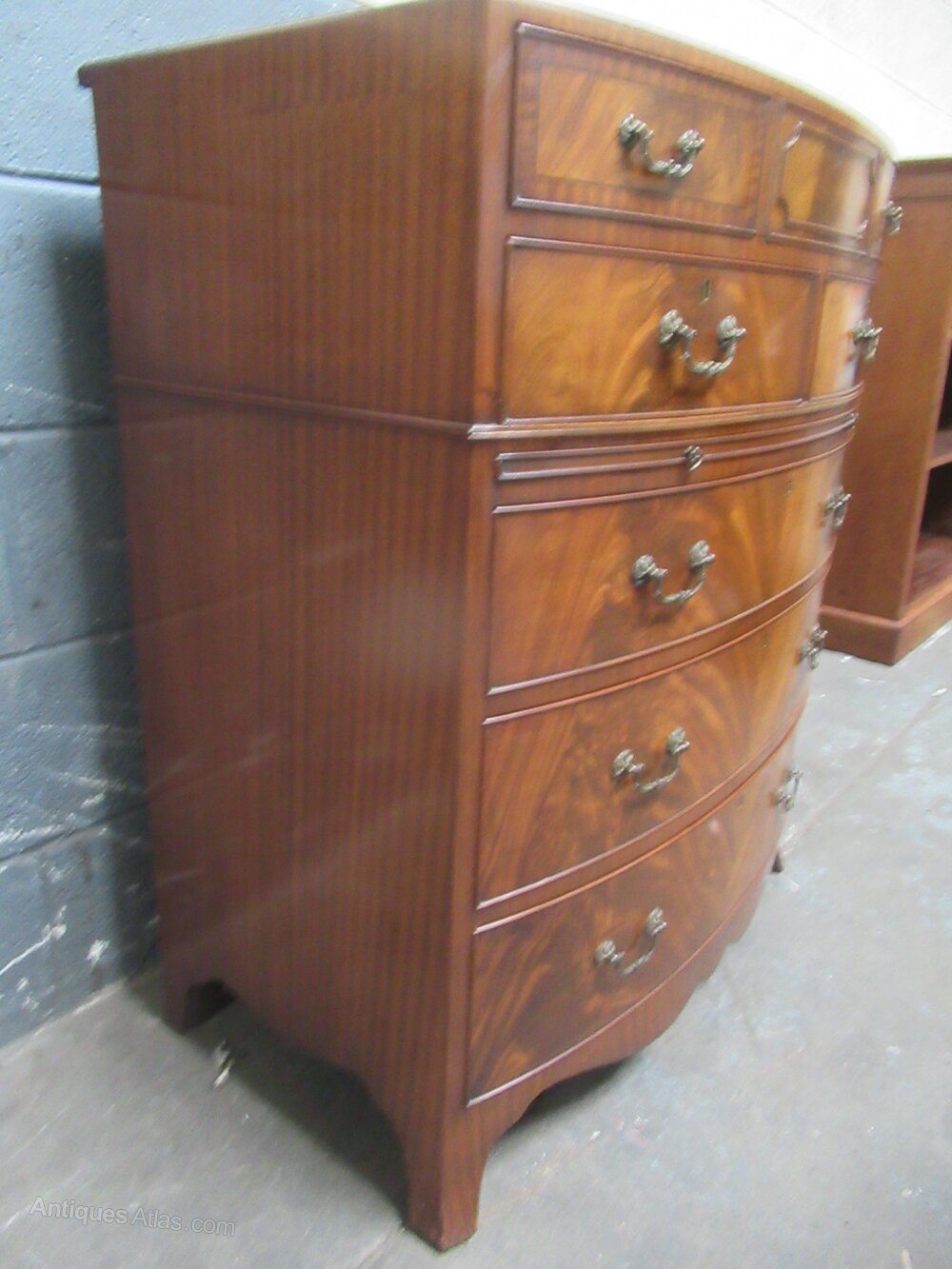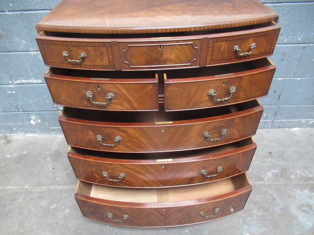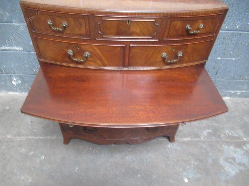 Good mahogany bow front chest of six drawers, all with brass handles. With two short and four long drawers, there is also a pull out work slide. The chest stands on bracket splay feet,