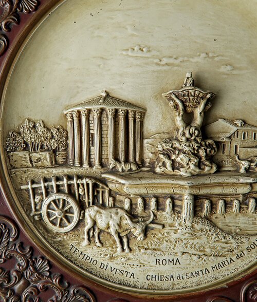 Rare and fascinating Grand Tour late 19th century German Musterschutz terracotta wall plaque depicting the Temple of Hercules Victor. Oxblood coloured edge with baroque foral decoration and monocromatic cream coloured high relief image of the Piazza Bocca della Verità with the inscription 'Roma Tempio di Vesta Chiesa di Santa Maria del Sole'. The Temple of Hercules Victor is often erroneously called the Temple of Vesta. This circular temple is the oldest preserved marble building in Rome and the the only one surviving in Greek marble. In 1140 it was converted to a church, later rededicated as Santa Maria del Sole (St. Mary of the Sun) until 1935 when the temple was recognised as an ancient monument, dating the plaque prior to 1935. The black reverse stamped 'JM' '1' '5142'. Musterschutz originally marked their wares with a BM but in 1863 they changed this to the now famous JM markings for Johann Maresch. Probably produced at the Baehr and Maresch factory in Aussig an der Elbe around 1890.