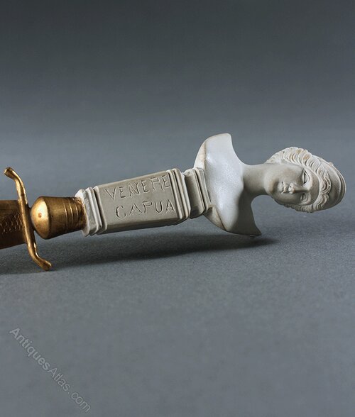 Fabulous late 19th Century Grand Tour Neapolitan carved lava stone and gilt bronze souvenir letter opener. Surmounted by a stunning finely carved bust of the Venus of Capua after the original classical statue in the National Archaeological Museum in Naples. The blade enscribed Napoli on obserse and Museo to the reverse. Italy, Naples, circa 1880.