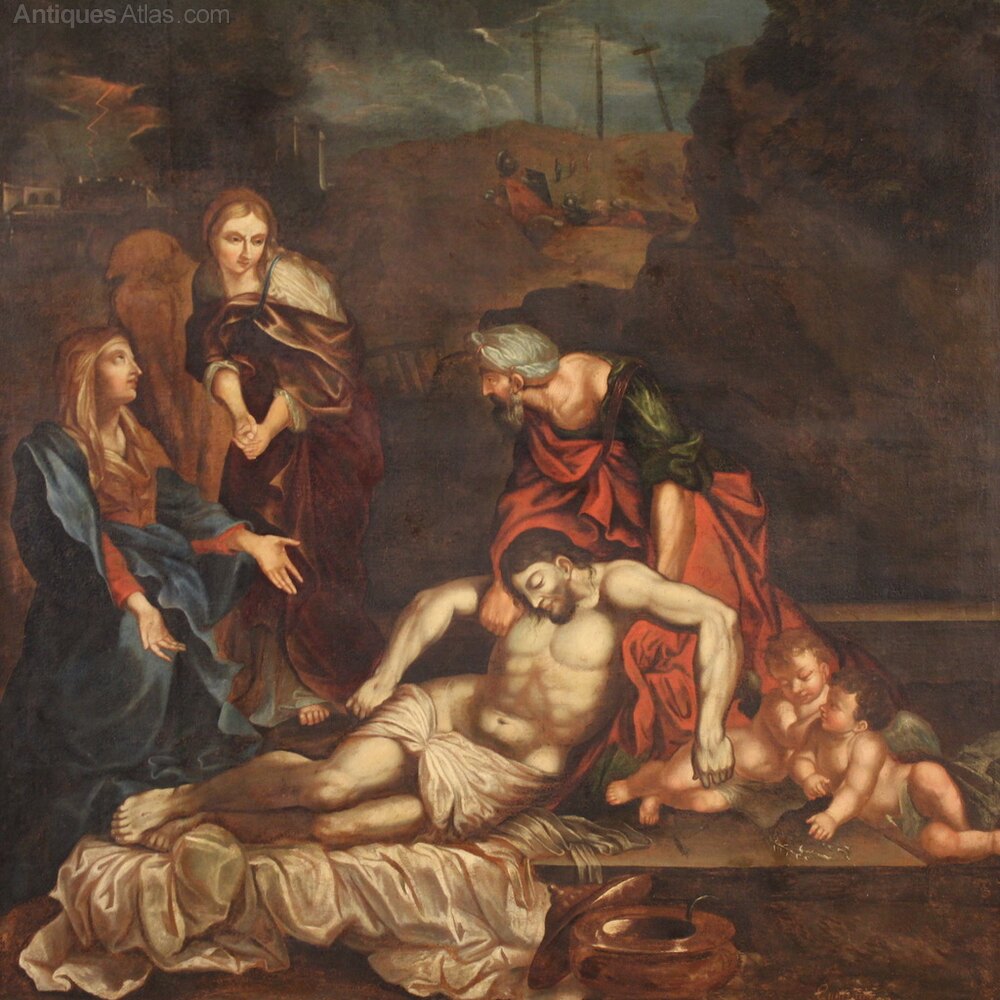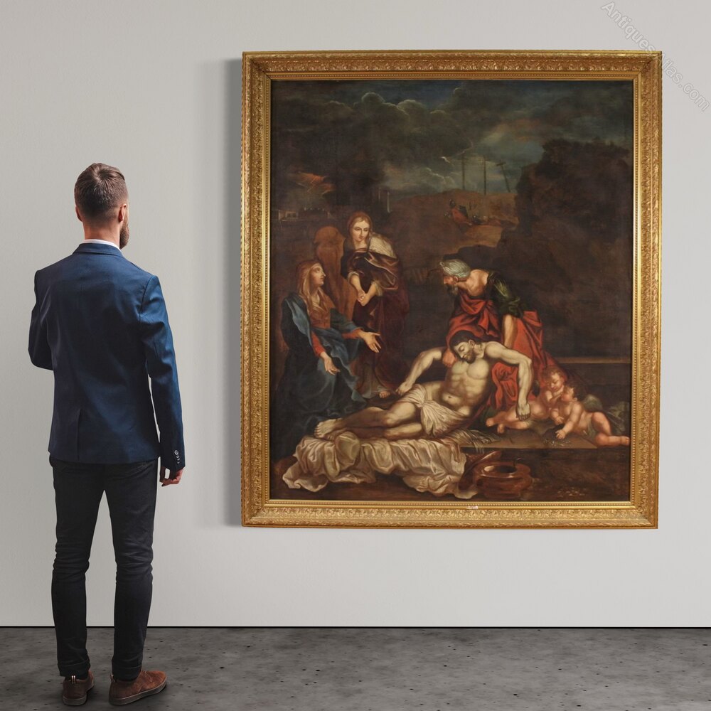 A great 17th-century religious painting. This painting oil on canvas depicts a poignant subject, highly popular in the Baroque era: The Lamentation over the Dead Christ. This intense and emotionally powerful artwork features a palette of brown and red earth tones. The reclining Christ is surrounded by figures sculpted by light, immersed in a dramatic atmosphere accentuated by the stormy sky over Golgotha.