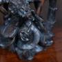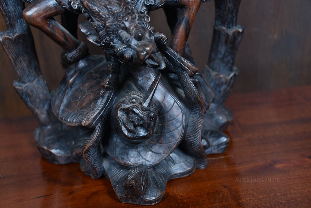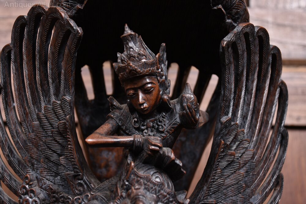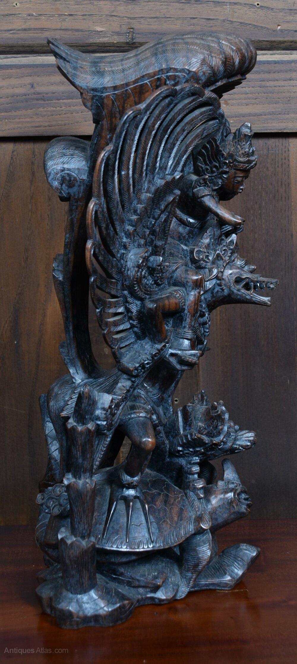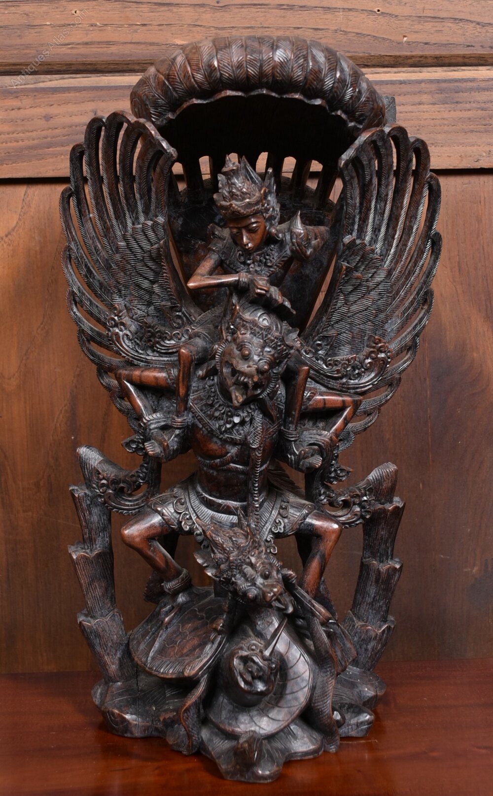 An exceptional hand-carved wooden sculpture depicting Garuda, the mythical bird-like guardian from Hindu and Buddhist tradition, shown in dynamic flight with wings outstretched. Garuda bears Vishnu aloft—seated in regal poise and holding a symbolic weapon—while a dragon-like creature writhes below, subdued beneath the divine force. Richly detailed throughout, from the feathered plumage to the expressive faces and flowing garments, this piece exemplifies masterful craftsmanship and mythological storytelling, likely rooted in Southeast Asian or Indian tradition.