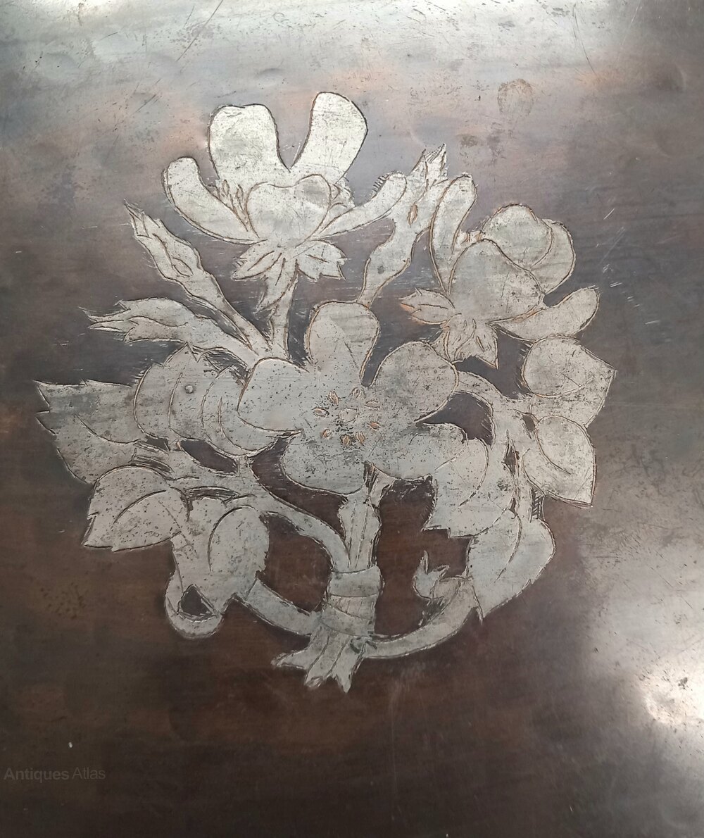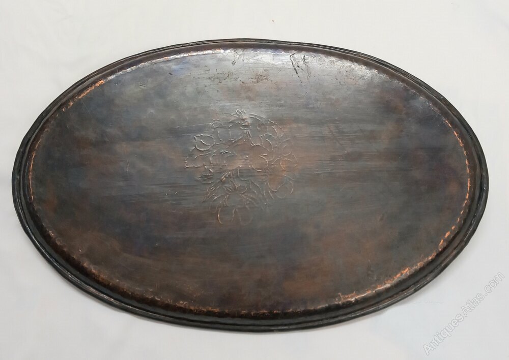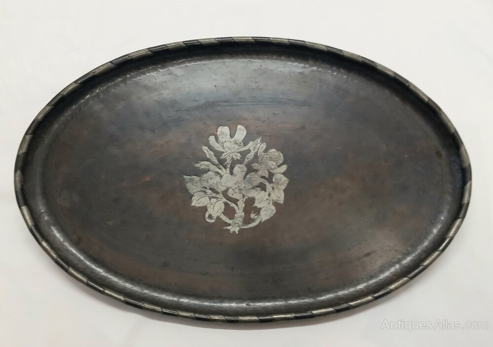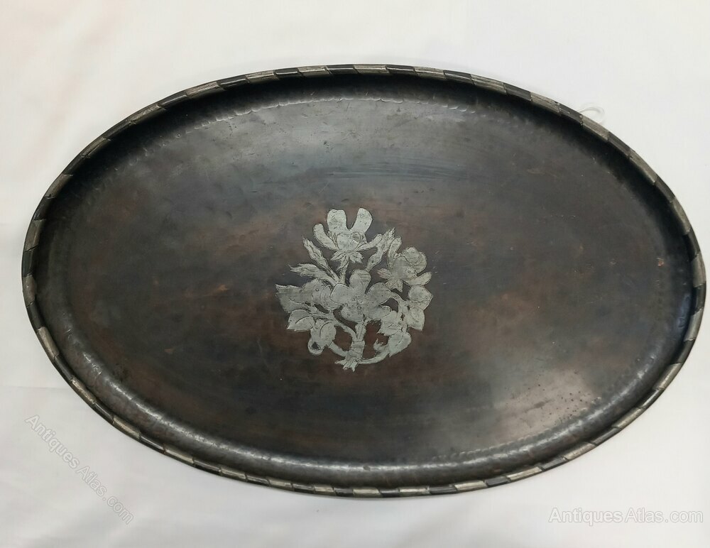 Beautiful Hugh Wallis 1871 - 1943 Arts and Crafts copper tray with pewter inlay. Marked HW and in excellent antique condition with a deep patina. Small marks as would be expected.