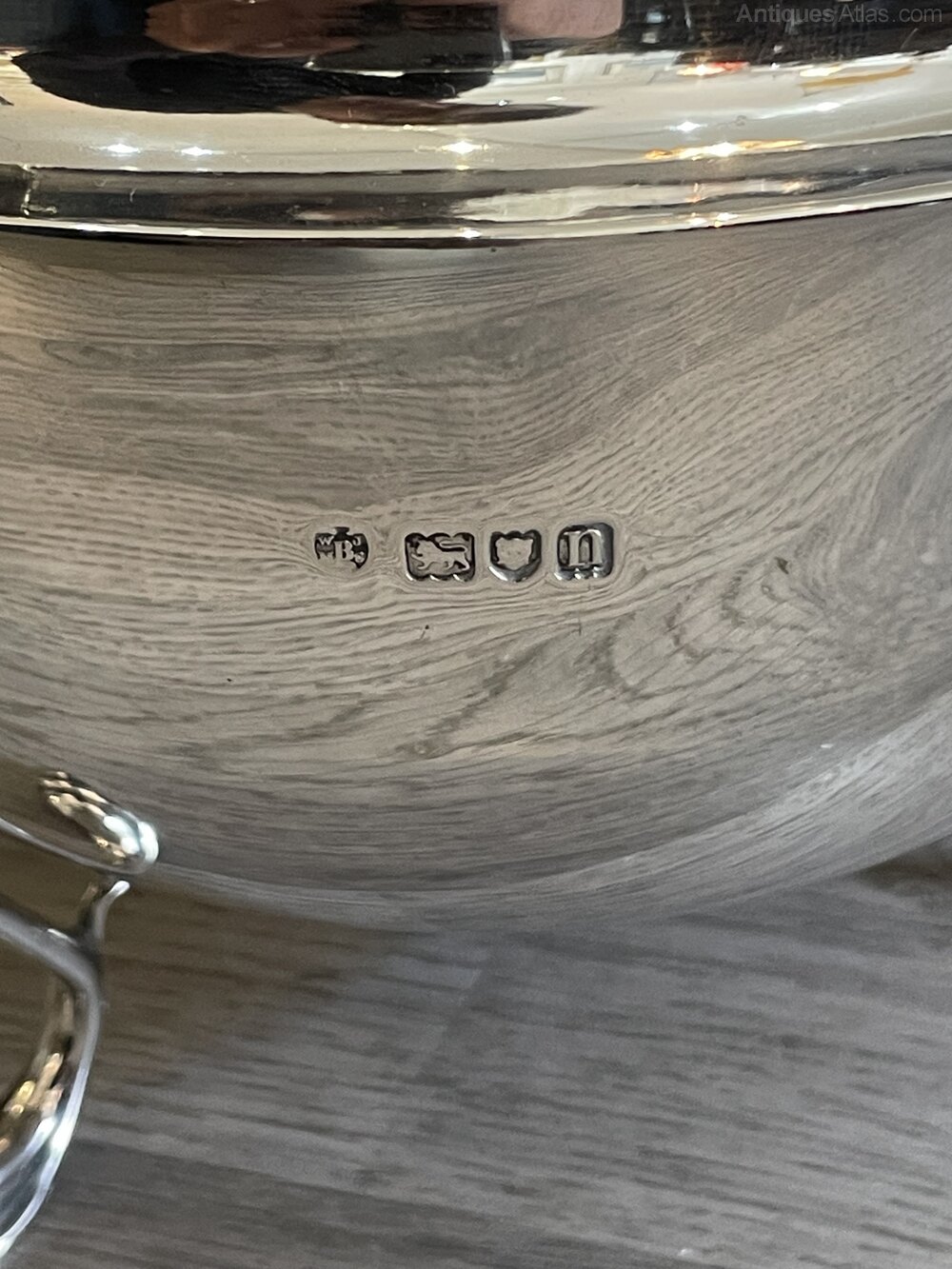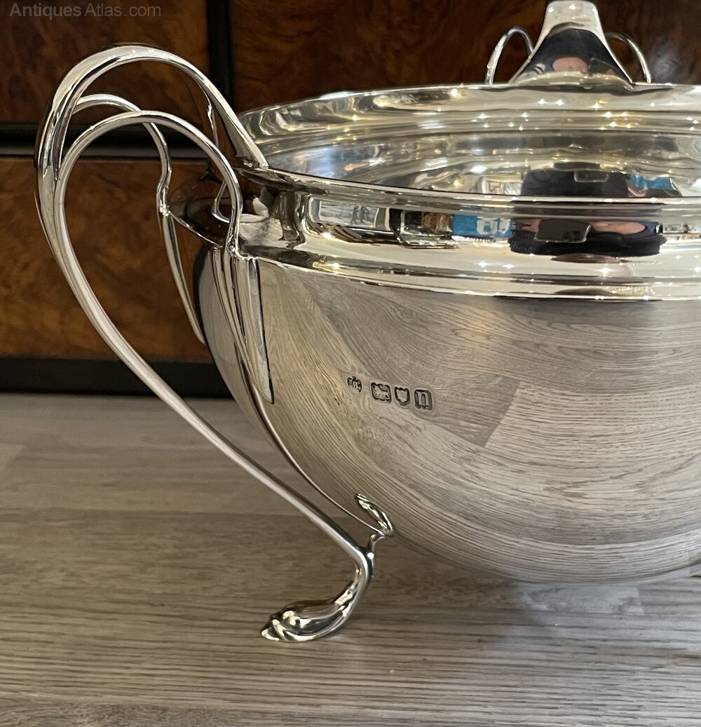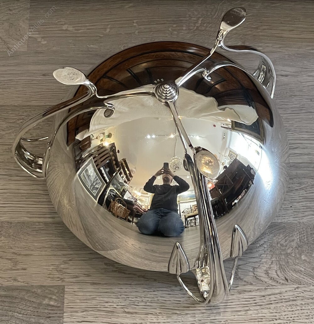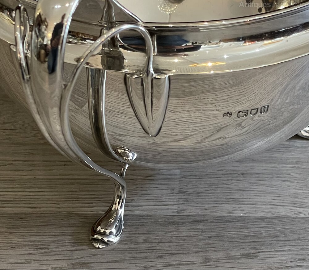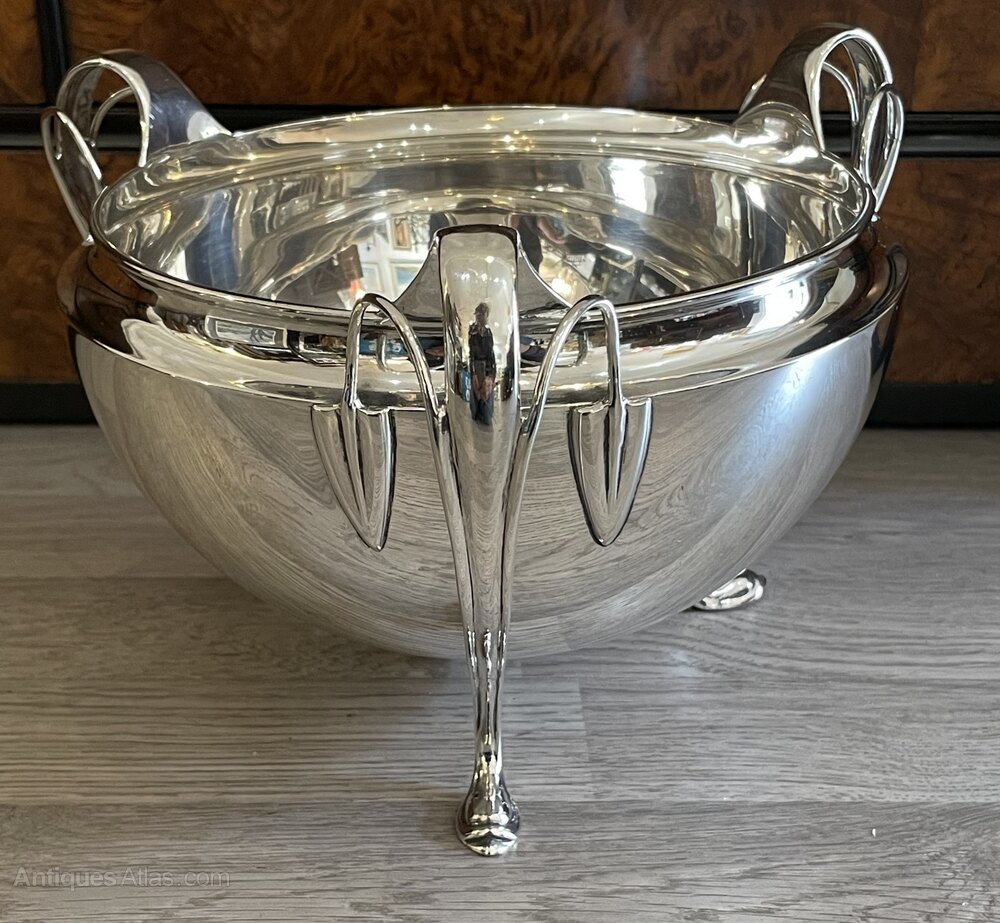 An impressive large Art Nouveau solid silver bowl raised on pad feet rising to three beautiful scrolled arms. Fully hallmarked for London 1908 by Edward Barnard & Sons Ltd.