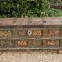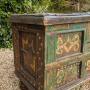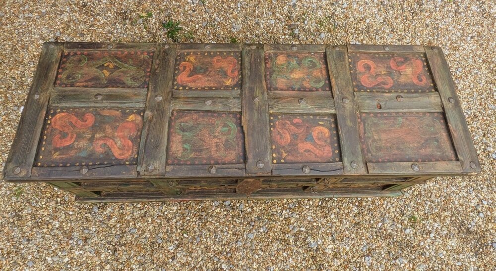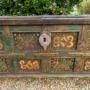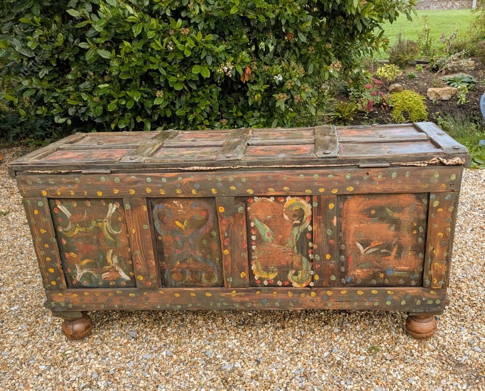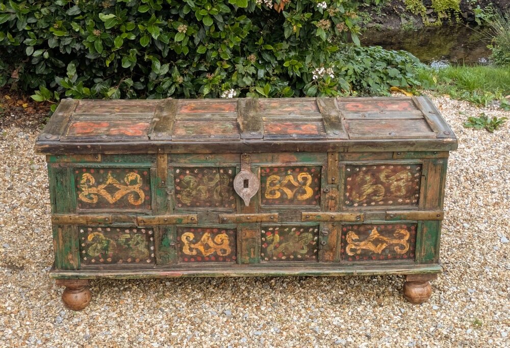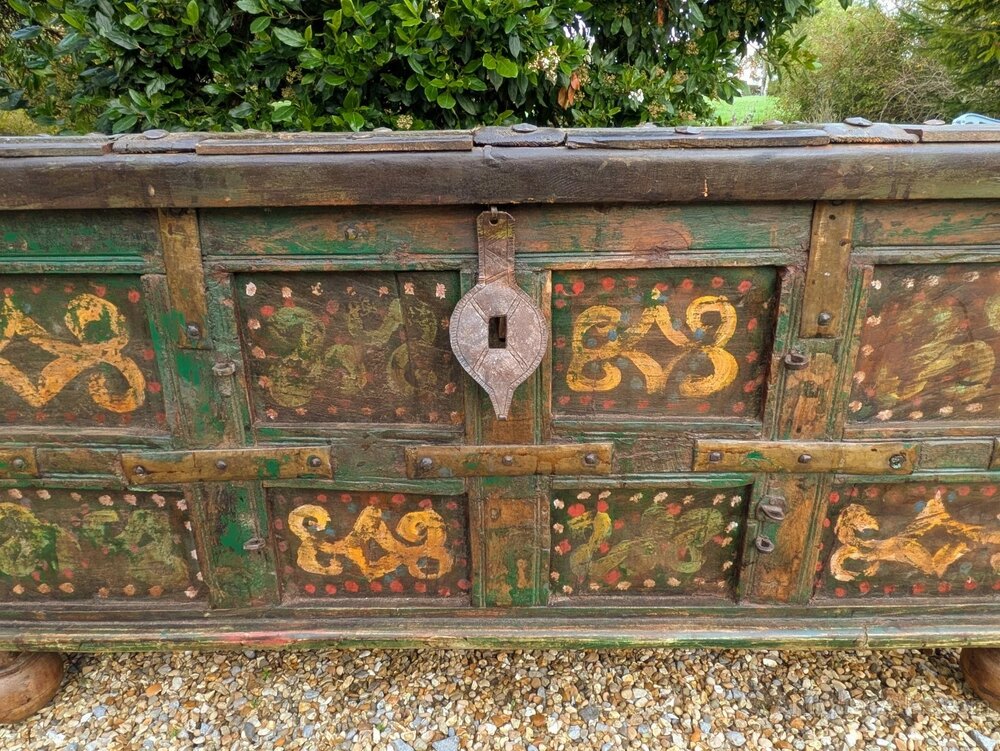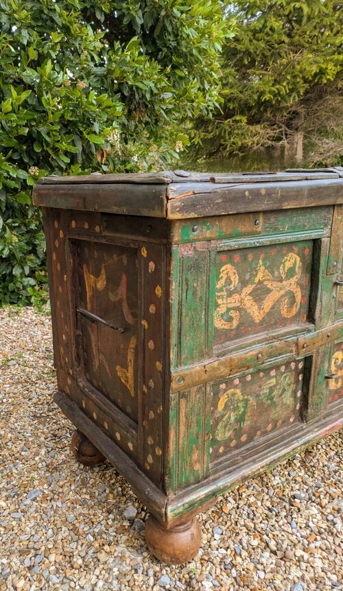 This is a fabulous 19th century Indian dowry chest with lovely hand painted decoration in its original bold colours. The hardwood chest is in excellent original condition with a really solid construction with studded iron strap work as well as its original hand forged metal clasp