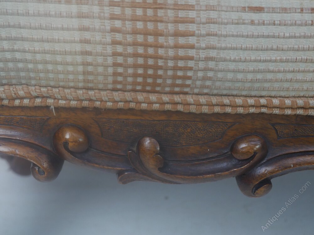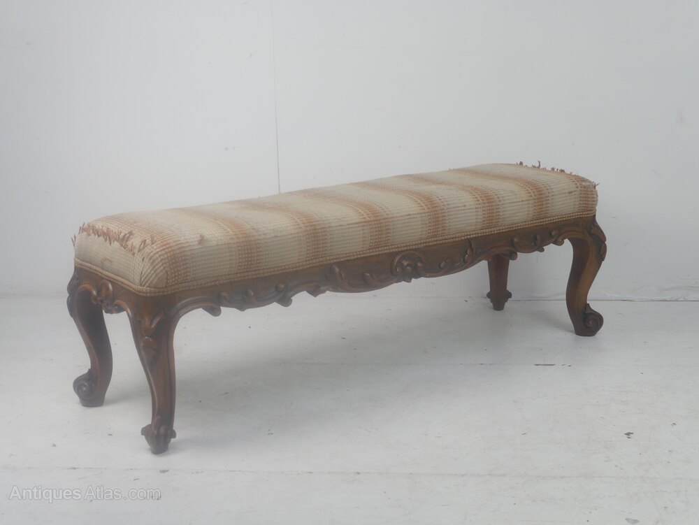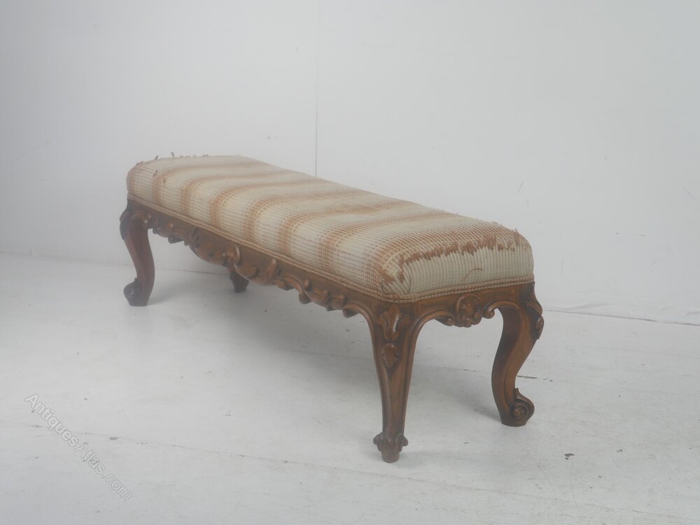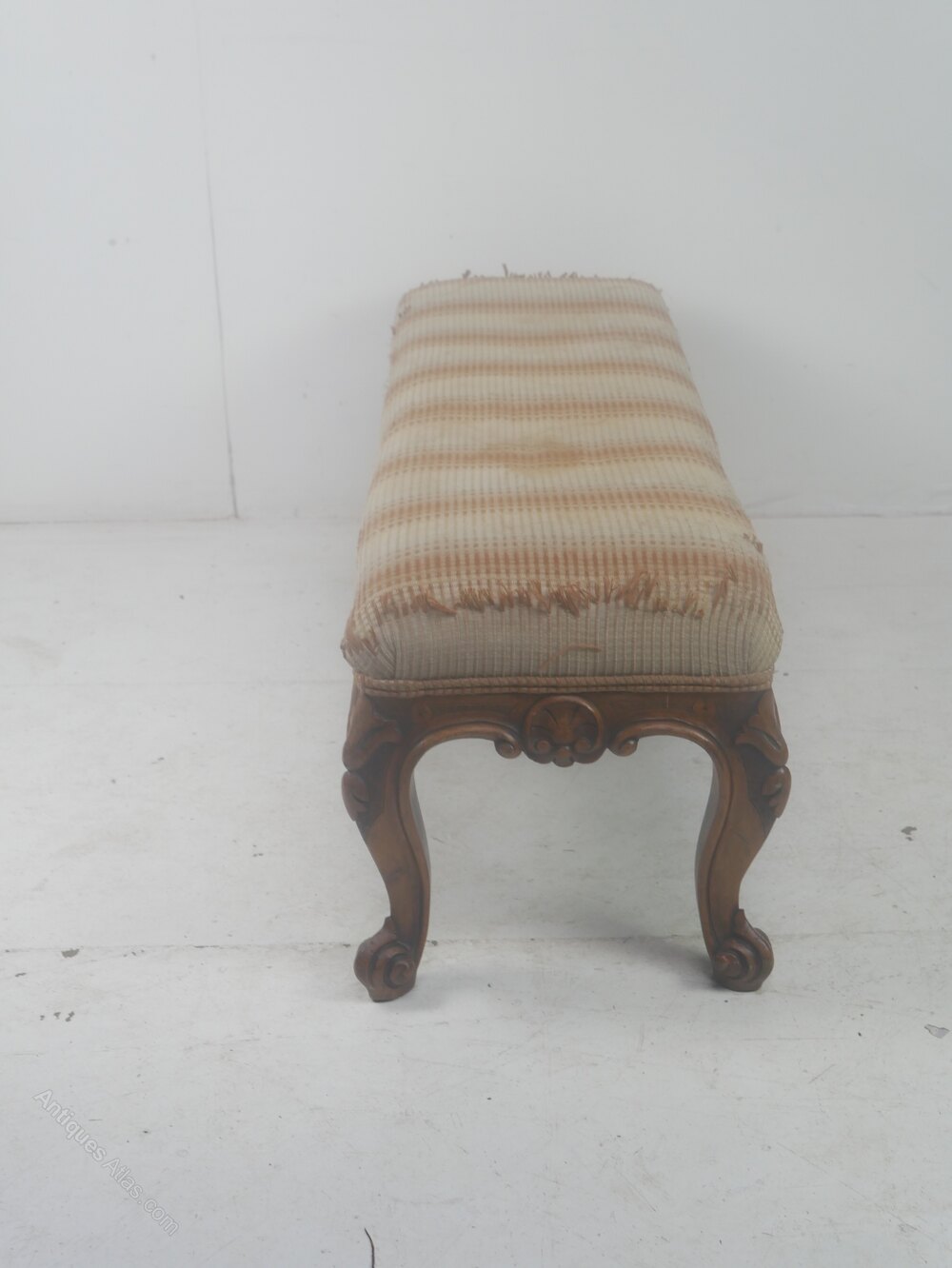A good quality Irish 19th century stool in walnut. The stool made in Dublin by Robert Strahan & Co, with the original label and stamp, well carved decoration, standing on strong cabriolet legs. The stool has some old treated woodworm to the under stretchers, made in the 1860s, all in firm condition, for upholstery.