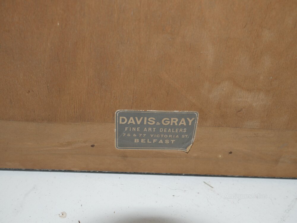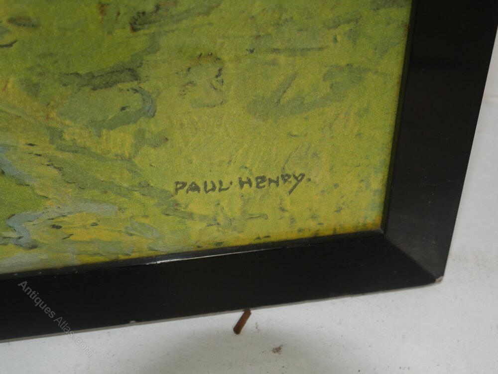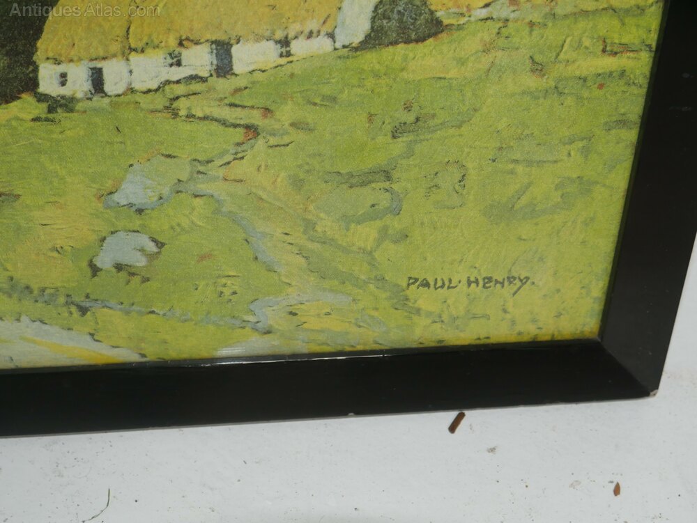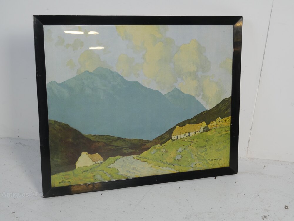 A decorative 1920's print of a painting by the renowned Irish artist Paul Henry. The print in a plain back ebonised frame with a label to the back for Davis & Gray, Victoria Street, Belfast art dealers and framers.