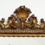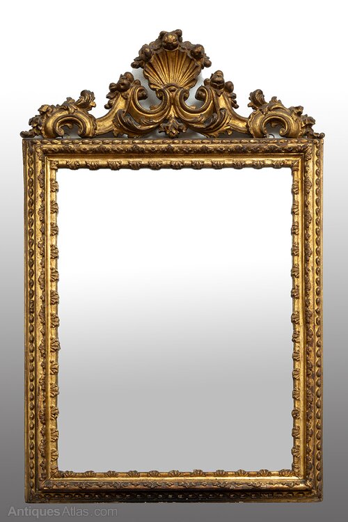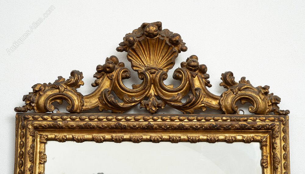 The mirror is set in a three-tiered carved frame and features a richly carved frieze at the top, terminating in a shell surmounted by flowers.