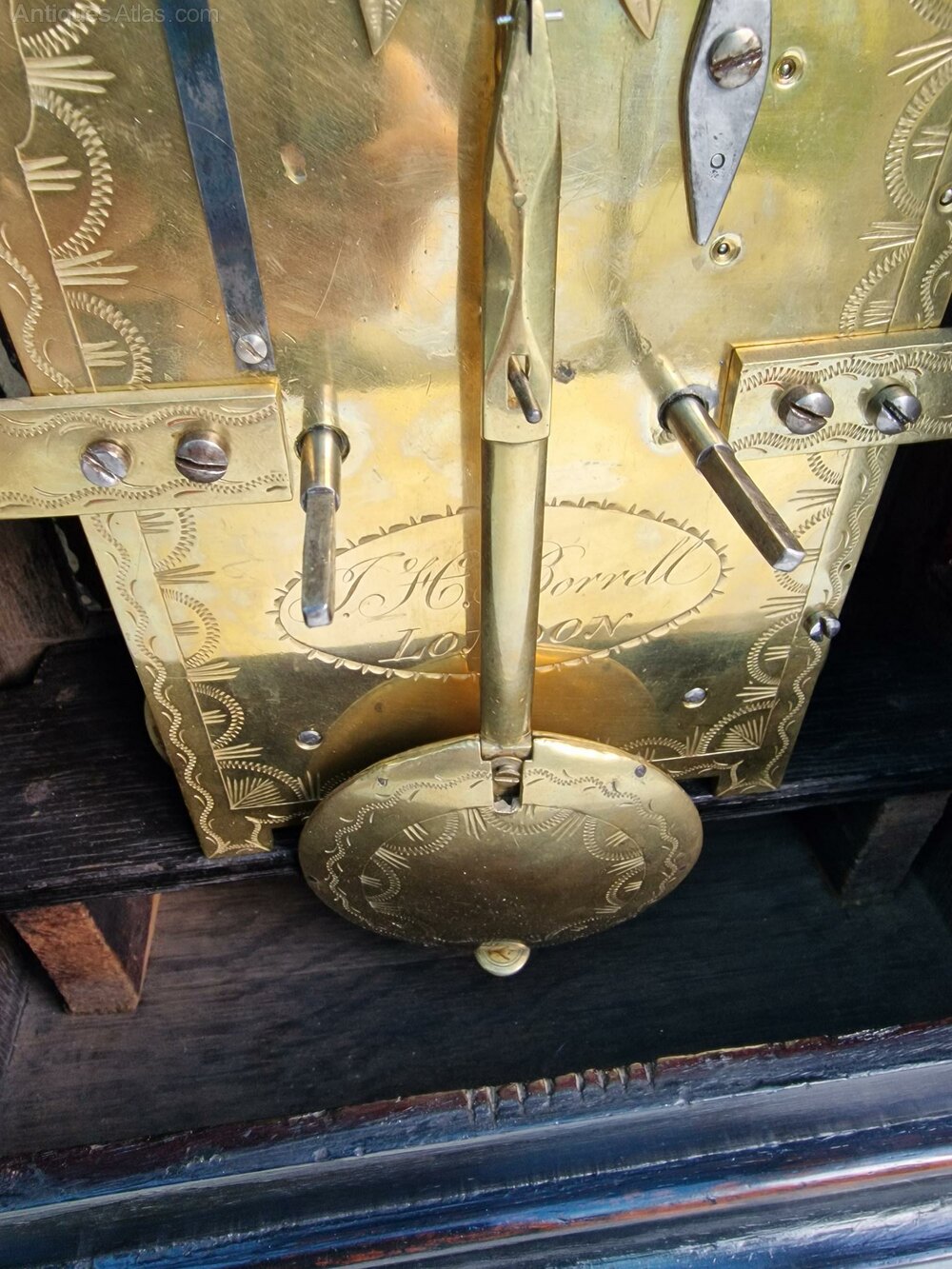 A London, ebonised bracket/table clock of good proportions. The case front has gilded brass edging to the dial and standing on gilded ogee feet. Brass fretwork to the case sides with silk backing. Gilded brass edging to the case sides. An arched painted dial signed 'J H Borrell 15 Wilderness Row, London' with a strike/silent to the arch. Lovely engraved hands. A fine quality, twin fusee mechanism striking the 1/2 hours and hours on a bell. A beautifully engraved backplate to the mechanism signed 'J H Borrell, London' within a cartouche. A glass back door showing the mechanism. Circa 1835.