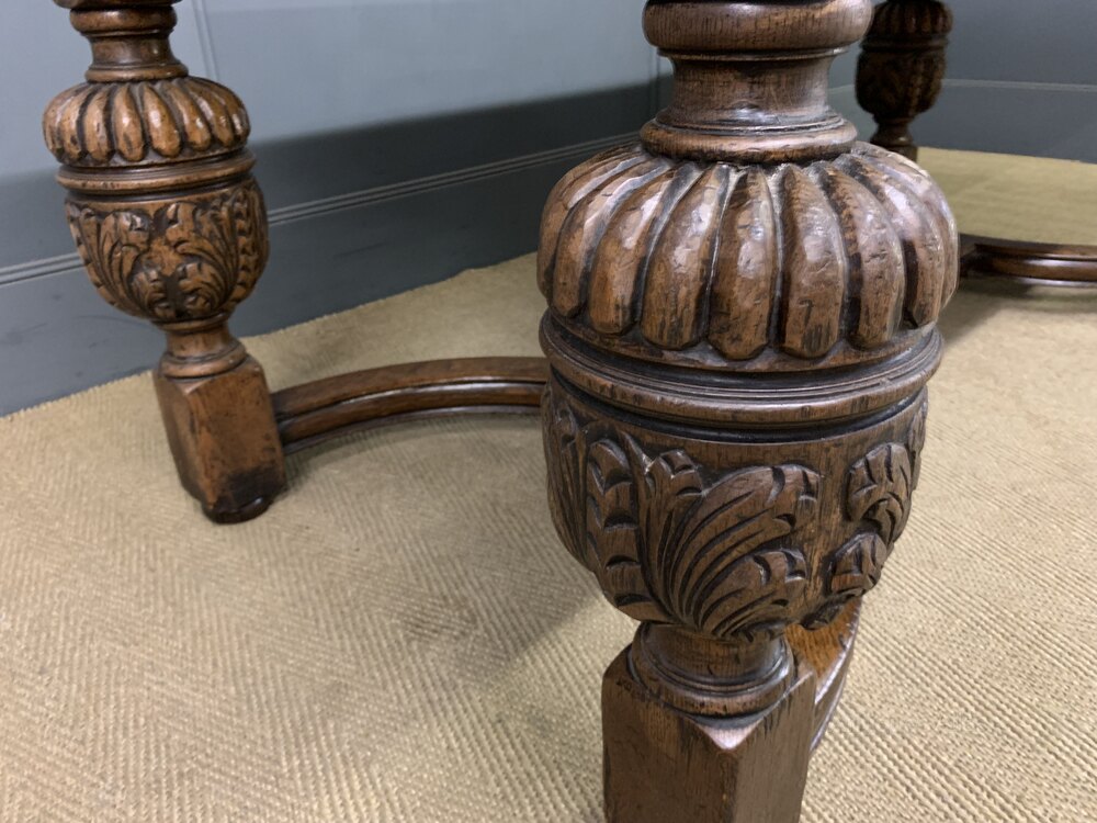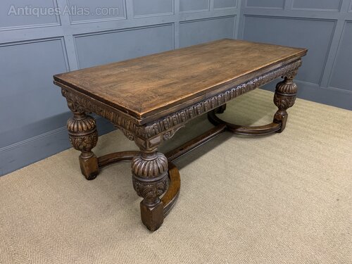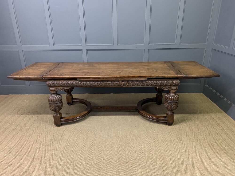 A splendid oak refectory draw leaf table in the Jacobean style. Very well constructed in solid English oak and of generous proportions (9ft long when extended). The top is of plank construction with cleated ends and a pair of leafs that drawer out. The base with bulbous turned crisply carved legs, carving to the freeze and united by a curved X-frame under-stretcher. Cleaned and waxed in our workshops and now offered for sale in excellent condition with a good colour and patina. Splits into sections for ease of installation. Seats upto a maximum of 10 people.
