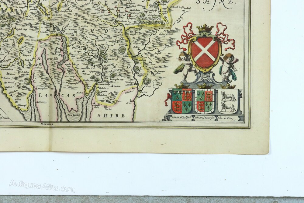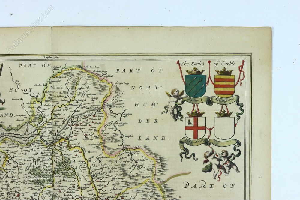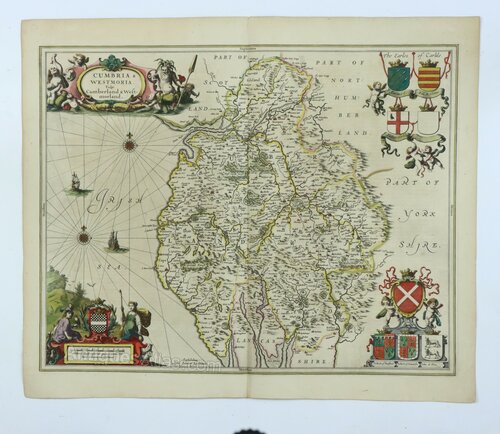 A hand-coloured original mid 17th century copperplate engraved map of Cumbria and Westmoria (now called Cumbria) by Jan Jansson, published c.1646 in Amsterdam, in very good antique condition. It has a decorative title cartouche, ornamental scale bar, several coats of arms supported by winged putti and two sailing ships and two compass roses in the Irish Sea. Latin verso.