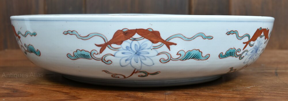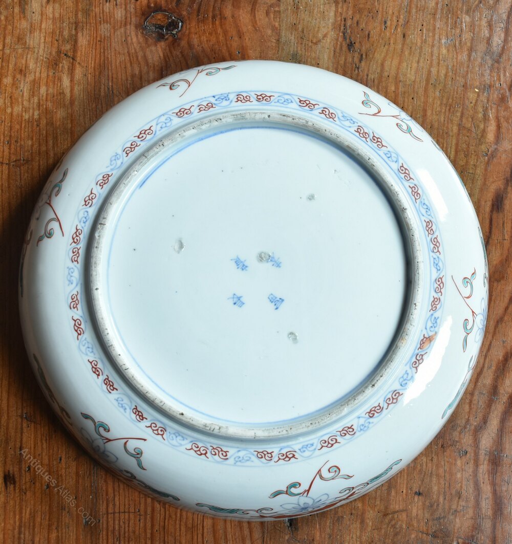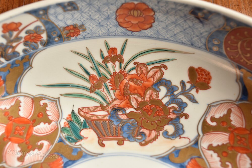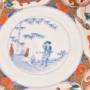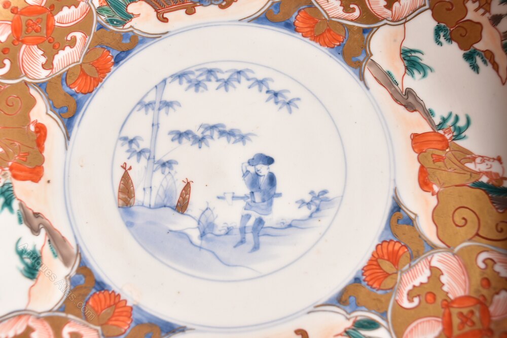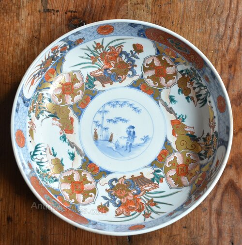 Fabulous Japanese Imari porcelain bowl featuring a richly detailed interior. At the centre, a tranquil blue-and-white landscape scene depicts a solitary figure beside water, framed by trees and distant mountains. Surrounding the central medallion is a vibrant border of stylised florals and geometric motifs in iron red, green, orange, and gilt, arranged in alternating panels that reflect the Imari tradition’s bold palette and rhythmic design. The outer rim is adorned with further floral embellishments and traditional patterns, enhancing the bowl’s visual depth and decorative appeal.