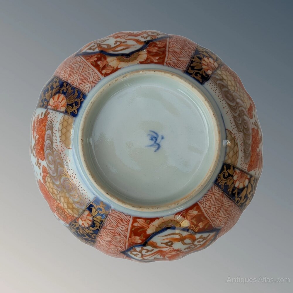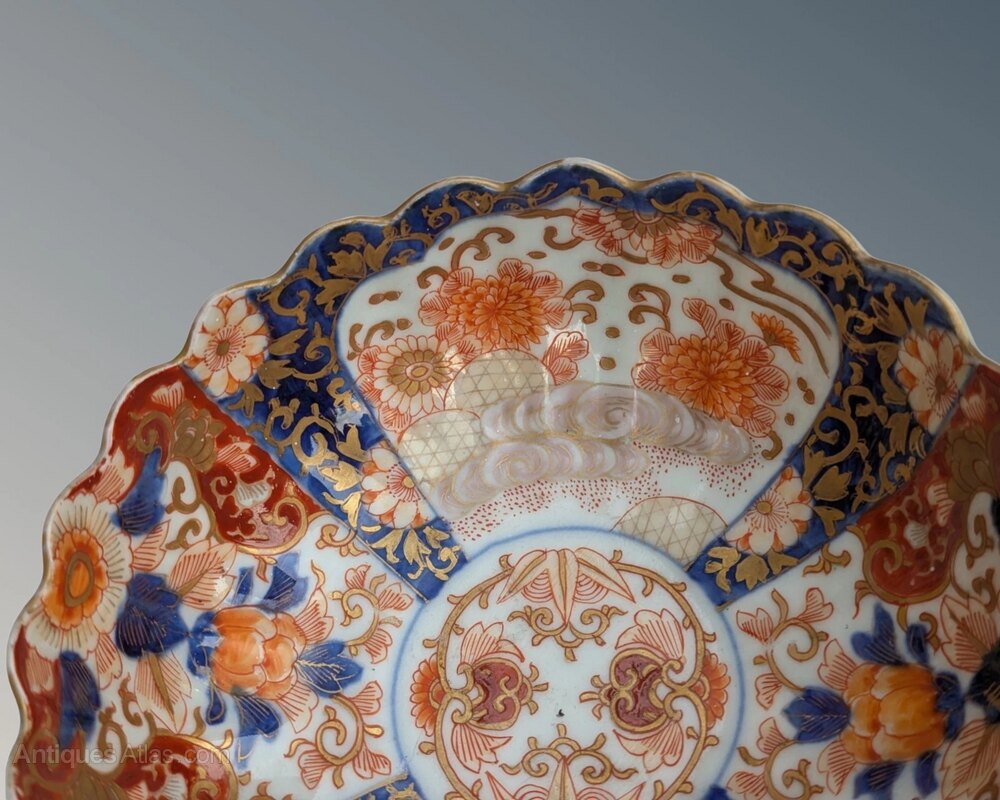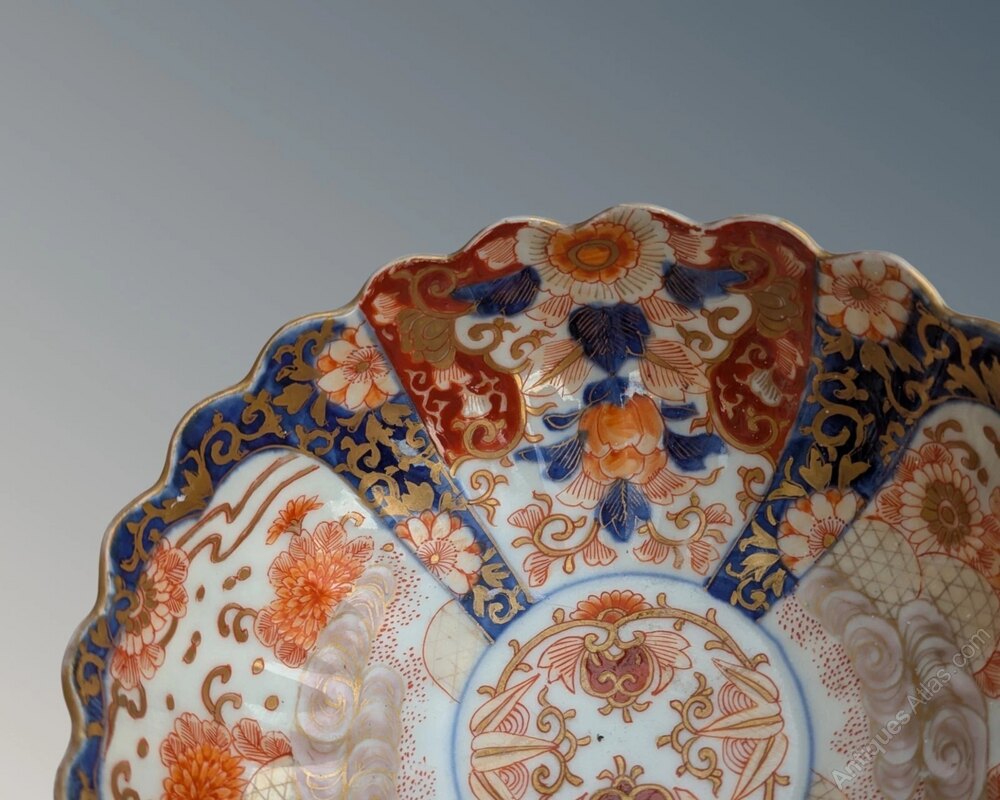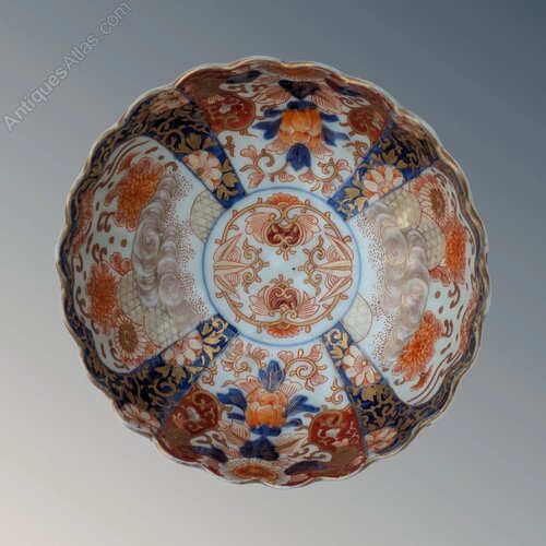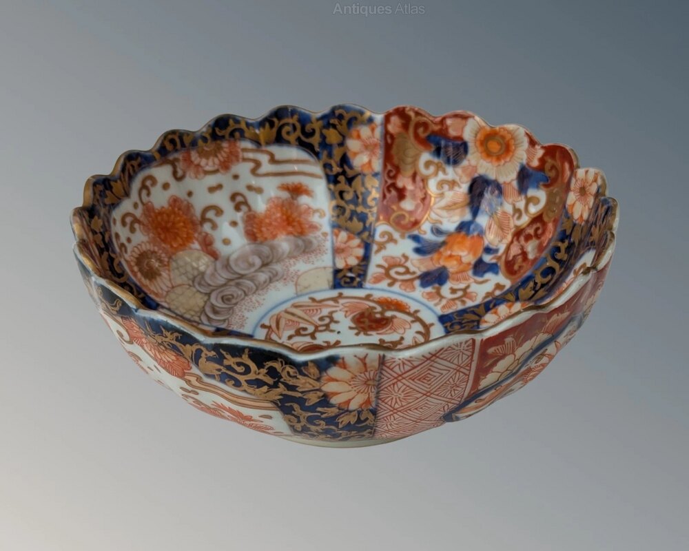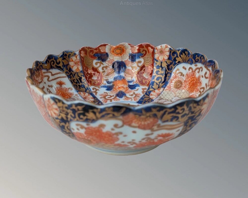 The bowl is a lovely scalloped shape to the rim and is hand painted and gilded with floral designs in the typical Imari colours.